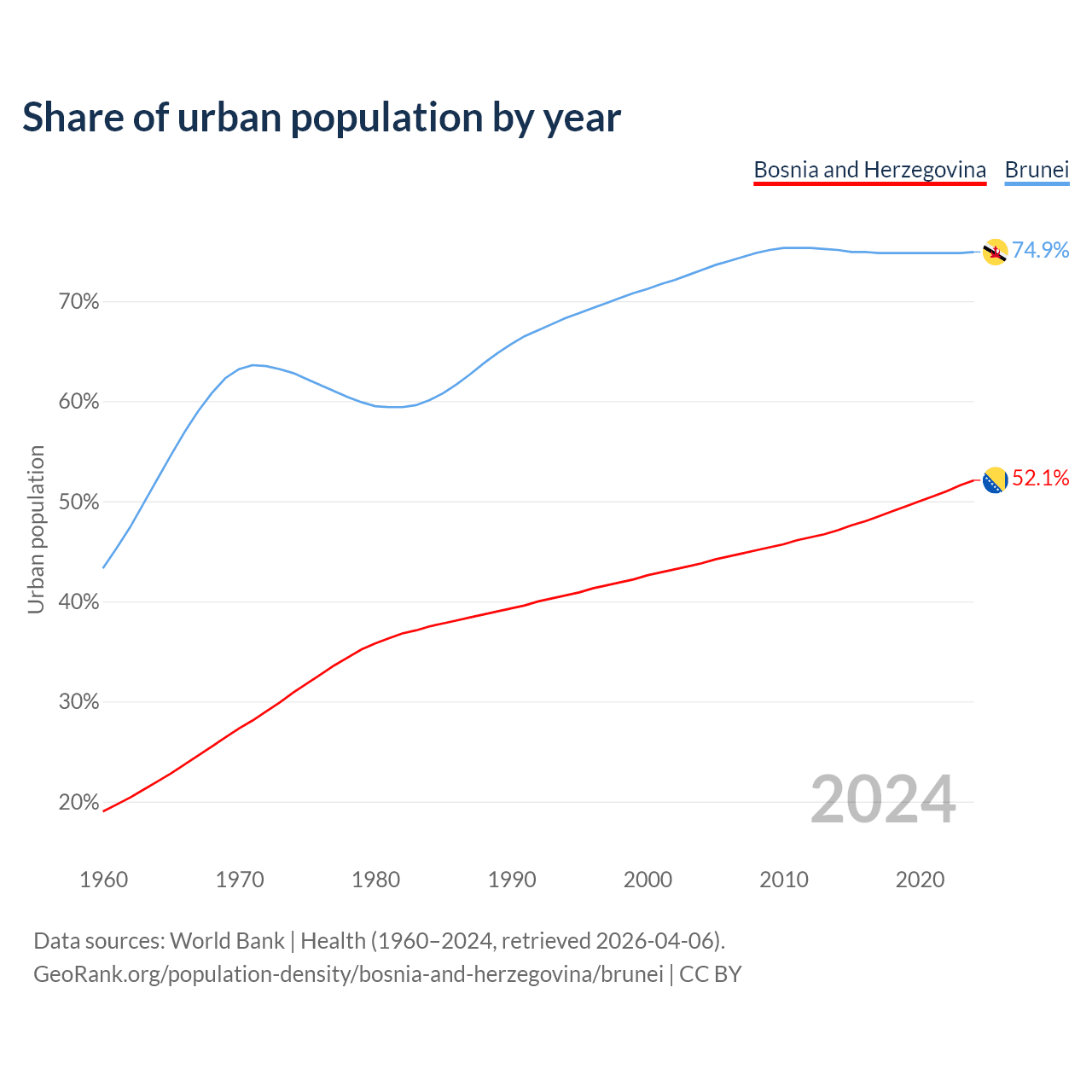 From 2004 to 2024, the share of urban population changed from 43.8% to 52.1% in Bosnia and Herzegovina and from 73.1% to 74.9% in Brunei.