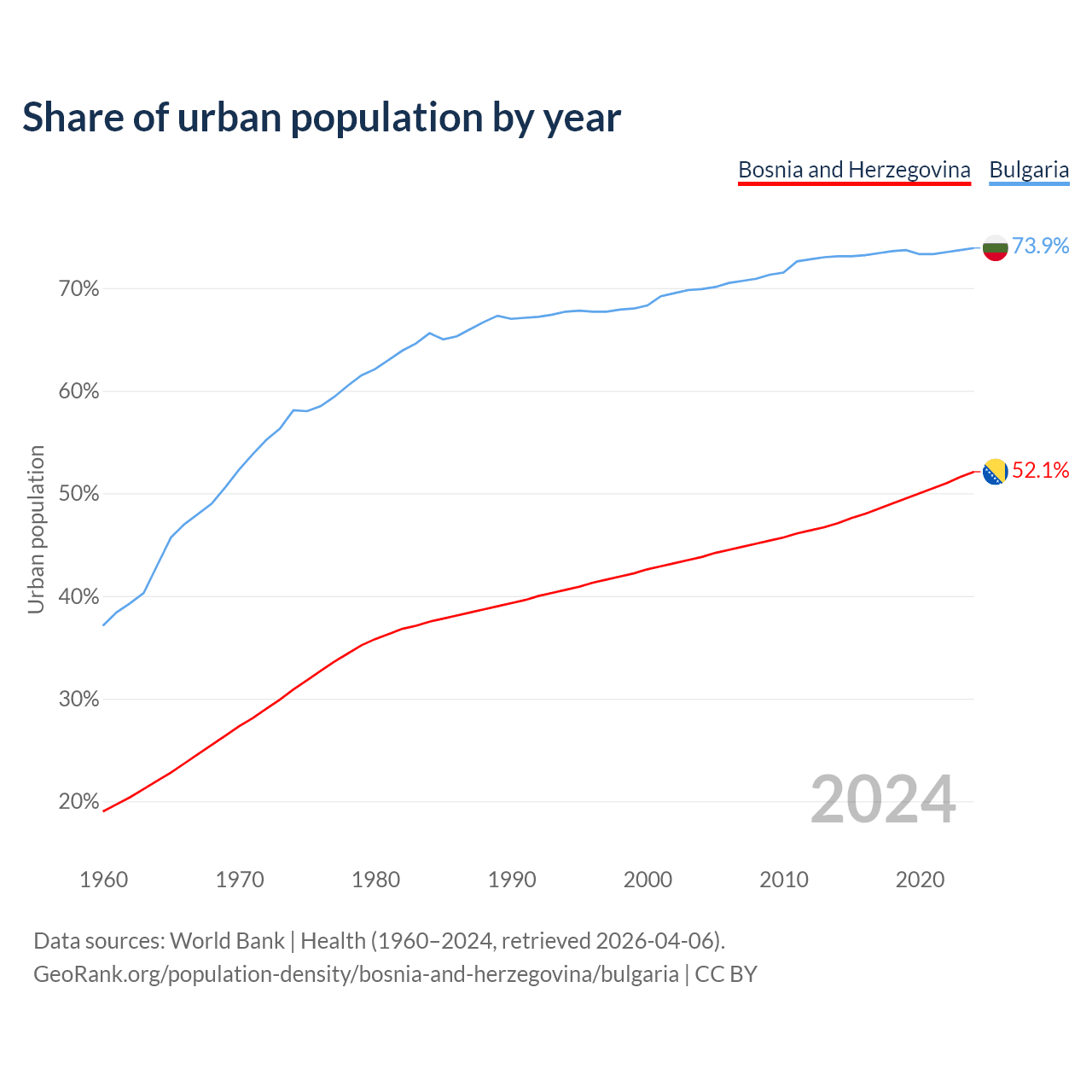 From 2004 to 2024, the share of urban population changed from 43.8% to 52.1% in Bosnia and Herzegovina and from 69.9% to 73.9% in Bulgaria.