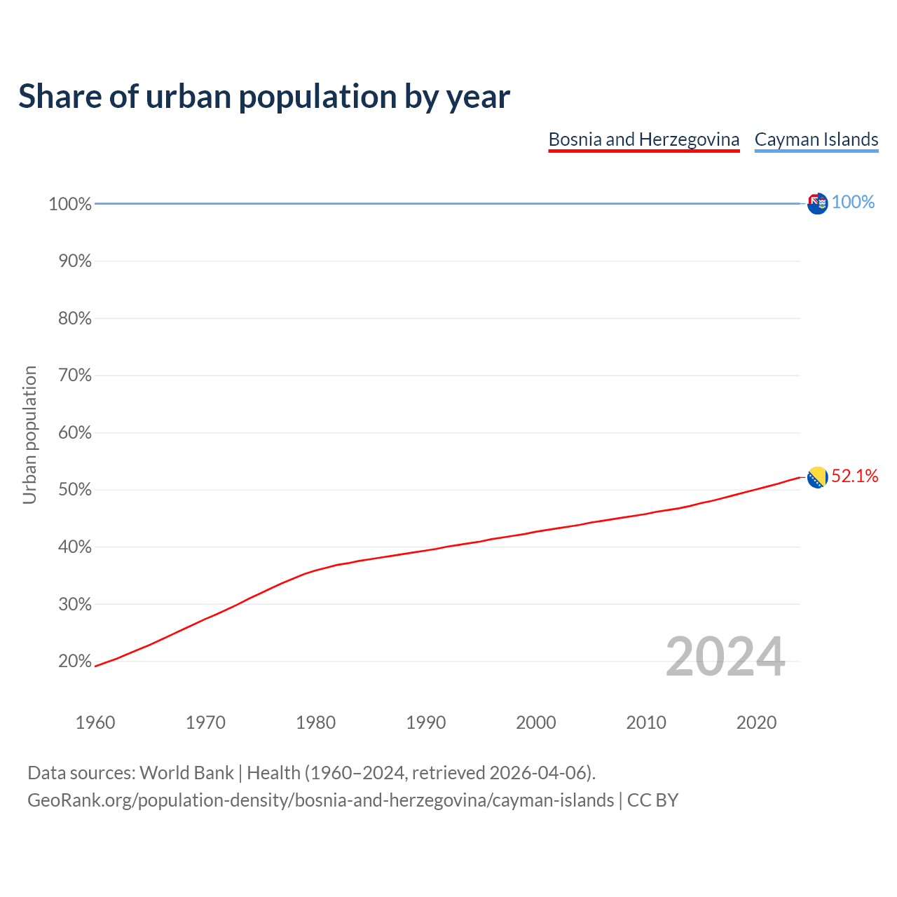 From 2004 to 2024, the share of urban population changed from 43.8% to 52.1% in Bosnia and Herzegovina and from 100% to 100% in the Cayman Islands.
