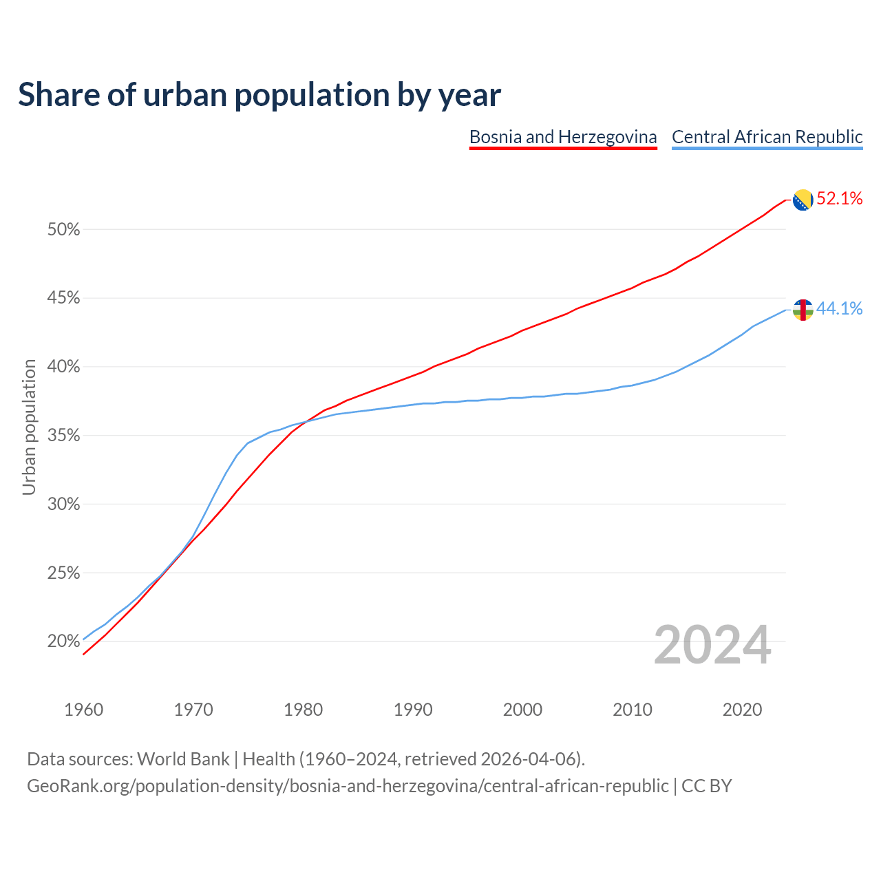 From 2004 to 2024, the share of urban population changed from 43.8% to 52.1% in Bosnia and Herzegovina and from 38% to 44.1% in the Central African Republic.
