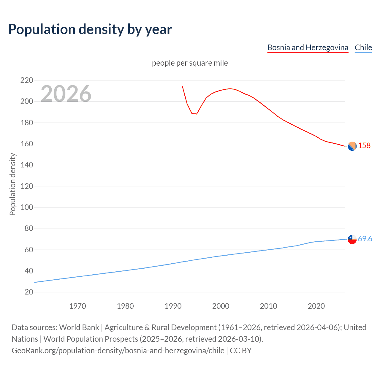 From 2006 to 2026, population density in Bosnia and Herzegovina decreased by 23.3%, compared to a 21% growth in Chile.