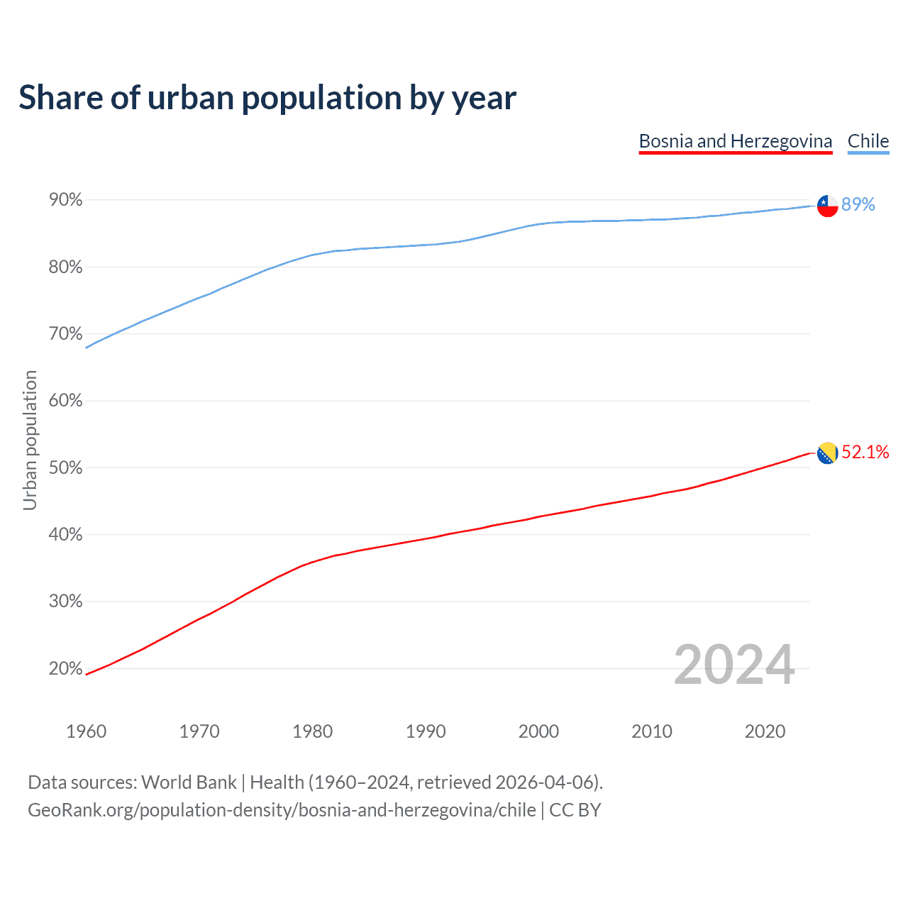 From 2004 to 2024, the share of urban population changed from 43.8% to 52.1% in Bosnia and Herzegovina and from 86.7% to 89% in Chile.