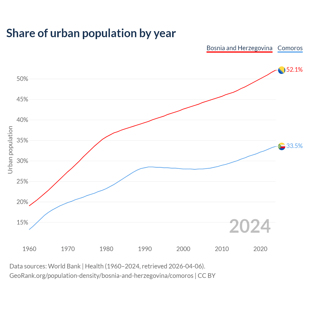 From 2004 to 2024, the share of urban population changed from 43.8% to 52.1% in Bosnia and Herzegovina and from 28% to 33.5% in Comoros.
