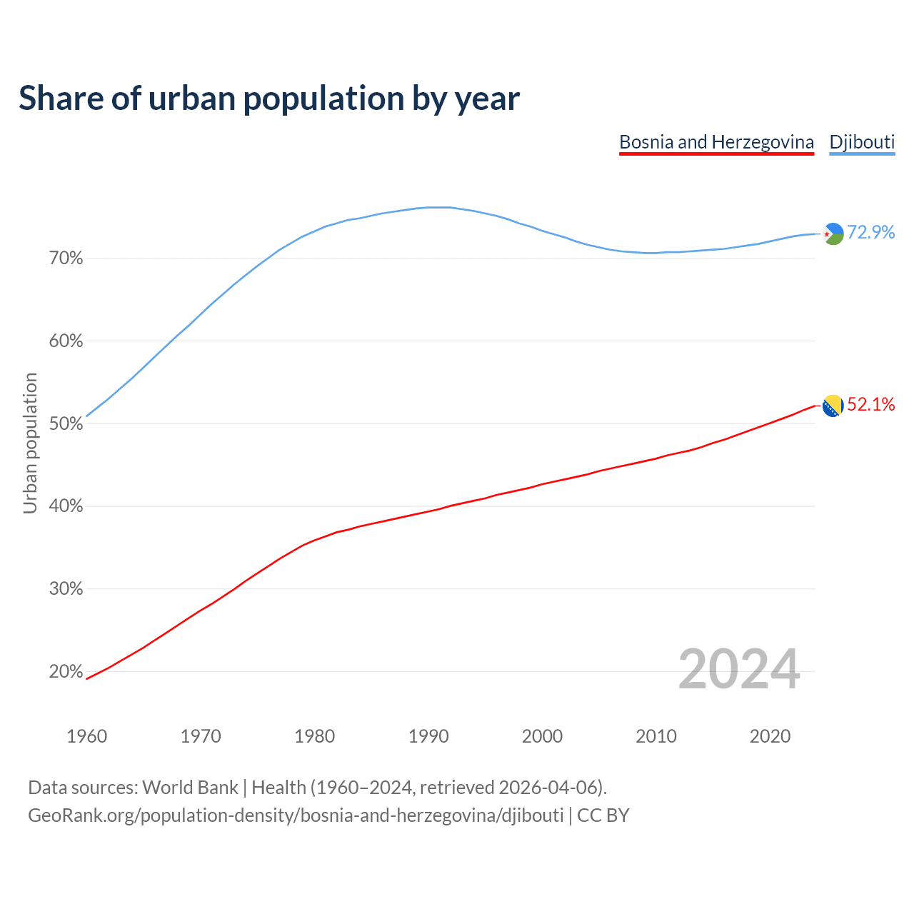 From 2004 to 2024, the share of urban population changed from 43.8% to 52.1% in Bosnia and Herzegovina and from 71.6% to 72.9% in Djibouti.
