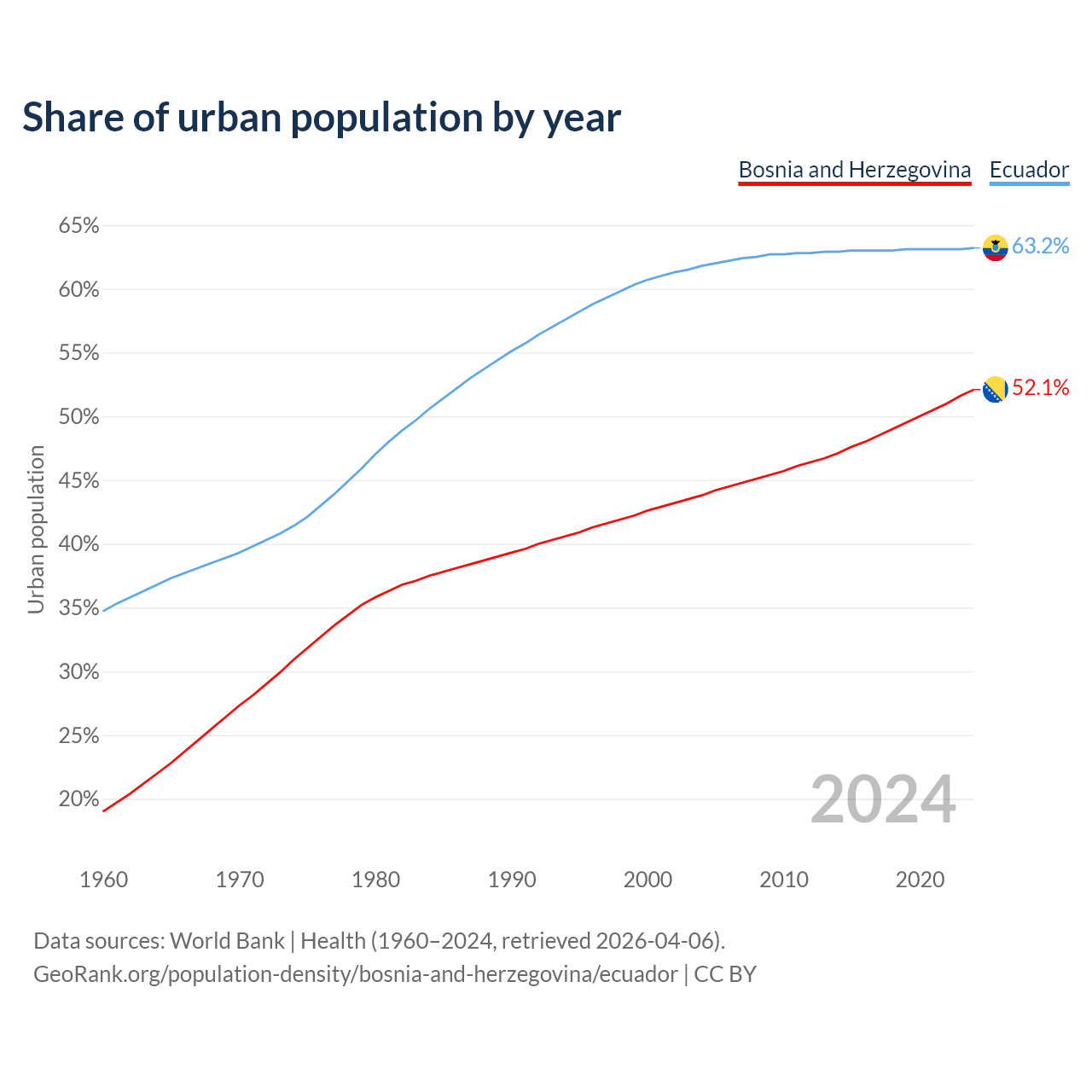 From 2004 to 2024, the share of urban population changed from 43.8% to 52.1% in Bosnia and Herzegovina and from 61.8% to 63.2% in Ecuador.