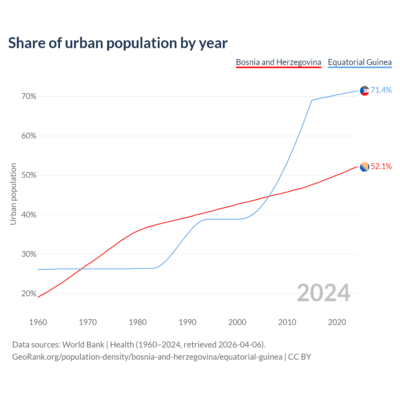 From 2004 to 2024, the share of urban population changed from 43.8% to 52.1% in Bosnia and Herzegovina and from 40.9% to 71.4% in Equatorial Guinea.