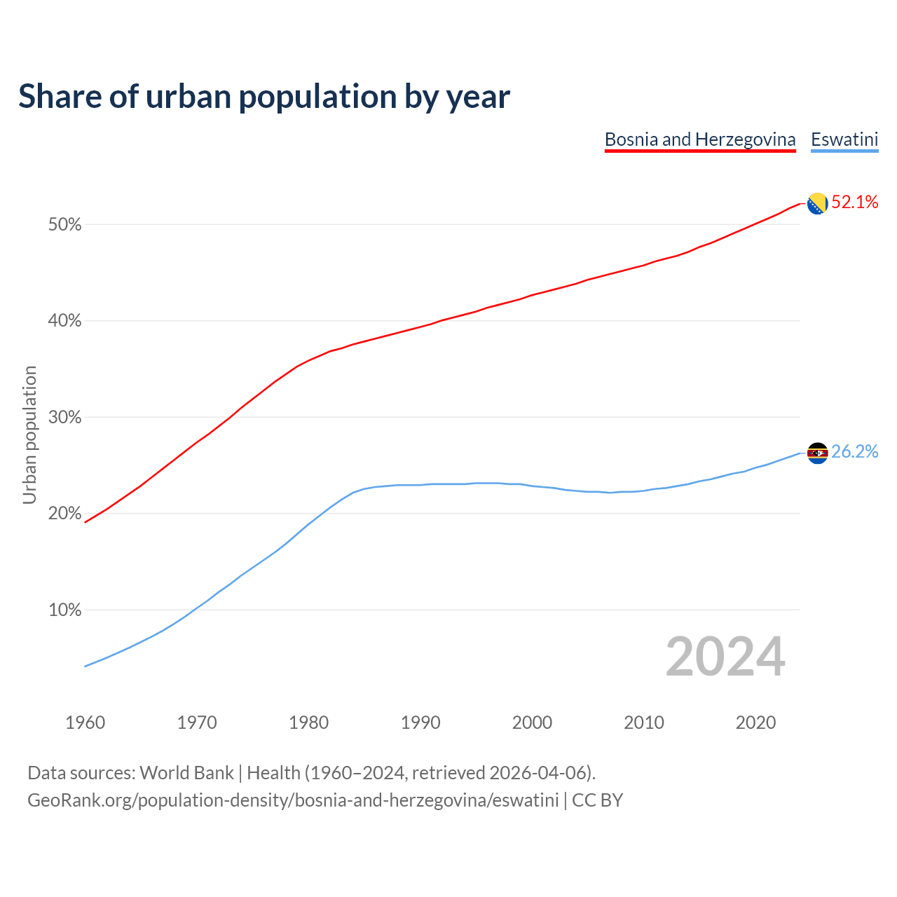 From 2004 to 2024, the share of urban population changed from 43.8% to 52.1% in Bosnia and Herzegovina and from 22.3% to 26.2% in Eswatini.