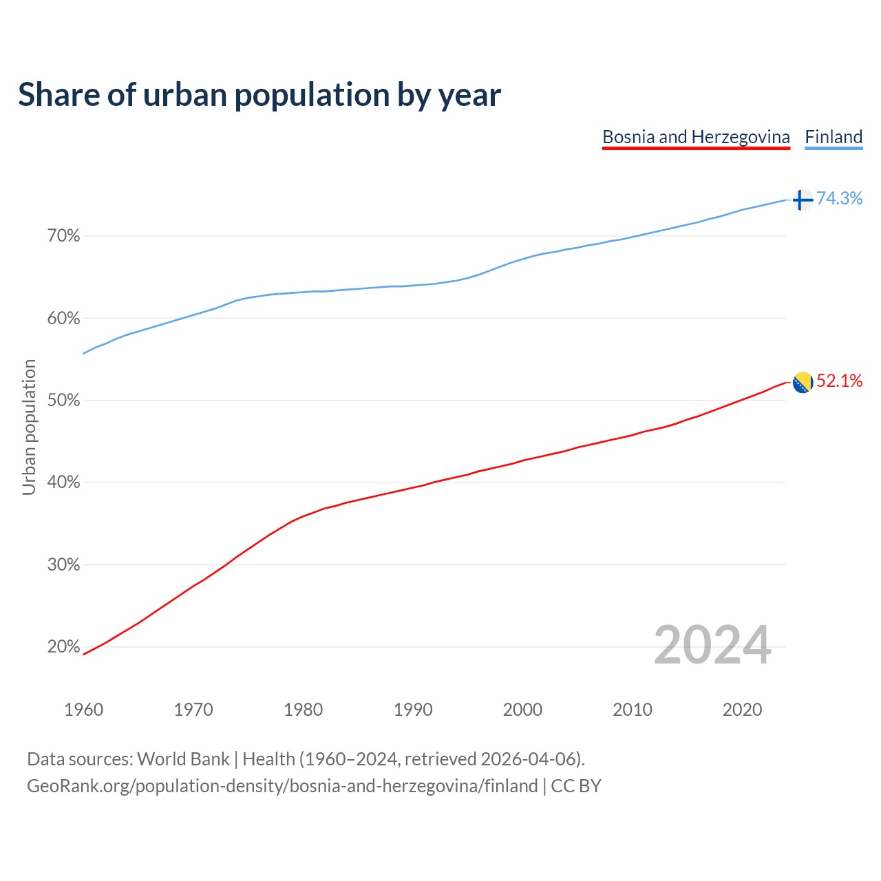 From 2004 to 2024, the share of urban population changed from 43.8% to 52.1% in Bosnia and Herzegovina and from 68.3% to 74.3% in Finland.