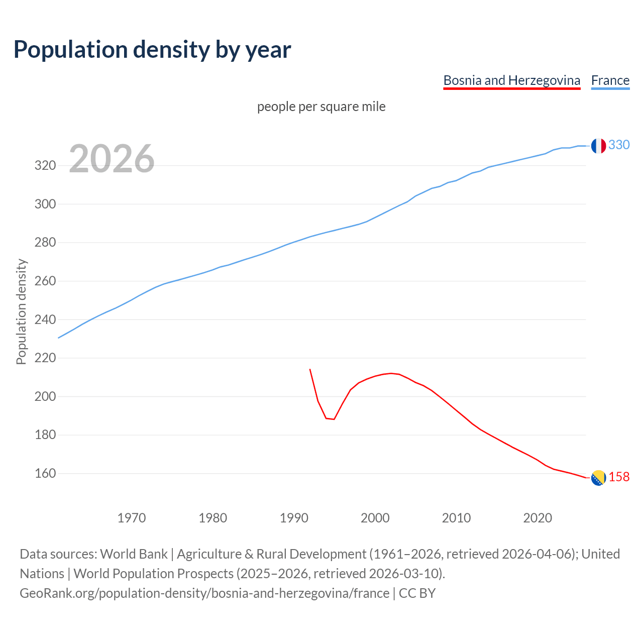 From 2006 to 2026, population density in Bosnia and Herzegovina decreased by 23.3%, compared to a 8.08% growth in France.