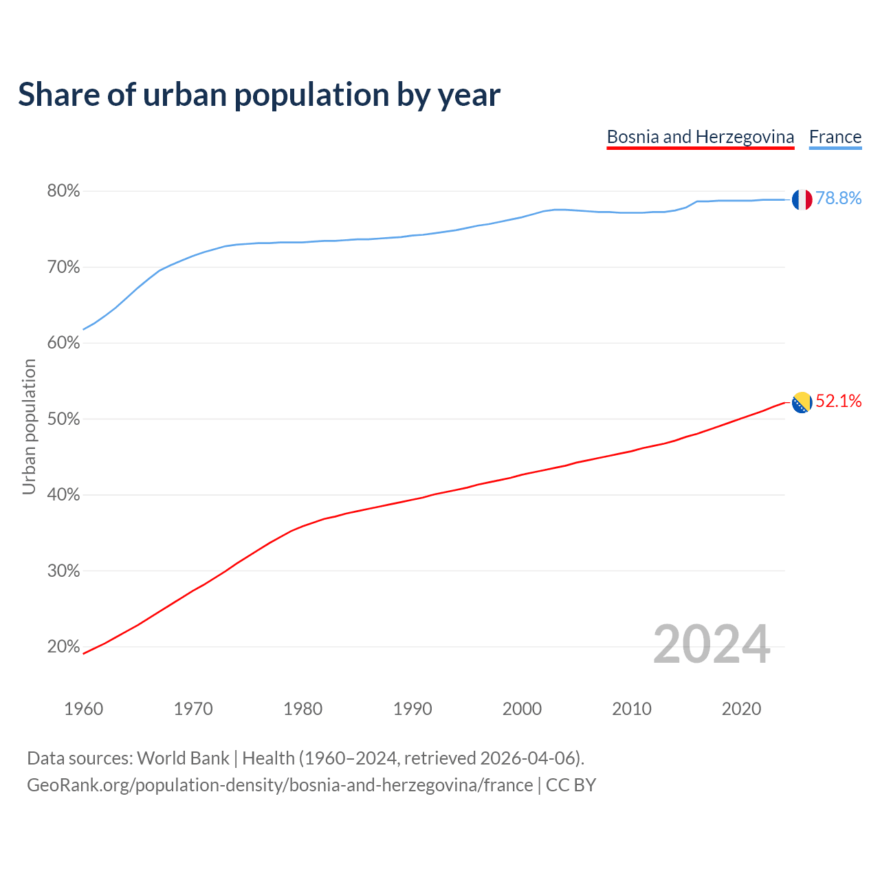 From 2004 to 2024, the share of urban population changed from 43.8% to 52.1% in Bosnia and Herzegovina and from 77.5% to 78.8% in France.