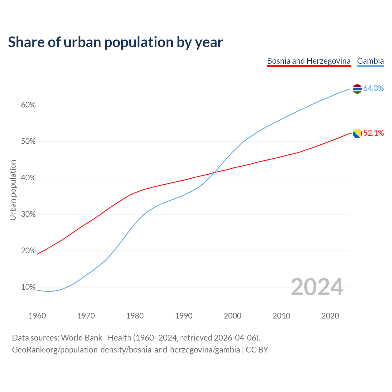 From 2004 to 2024, the share of urban population changed from 43.8% to 52.1% in Bosnia and Herzegovina and from 51.5% to 64.3% in the Gambia.