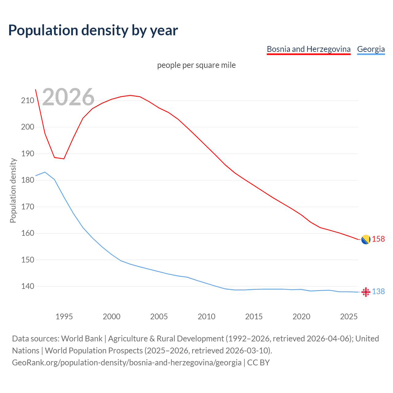 From 2006 to 2026, population density in Bosnia and Herzegovina decreased by 23.3%, compared to a 4.71% decline in Georgia.