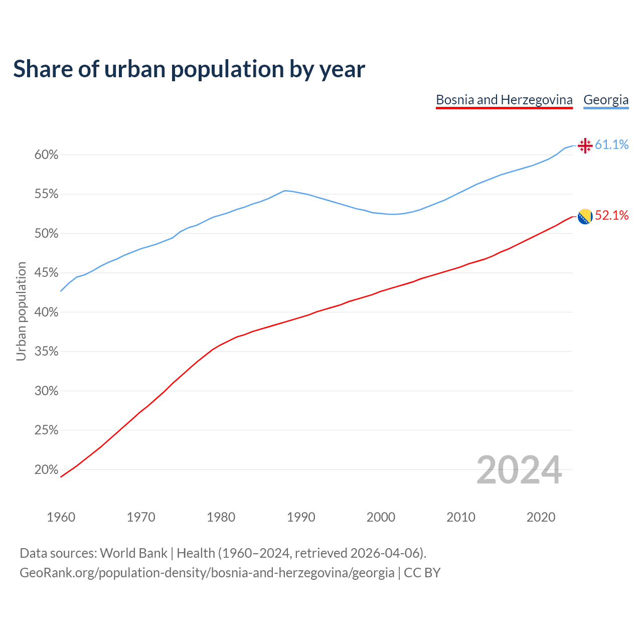 From 2004 to 2024, the share of urban population changed from 43.8% to 52.1% in Bosnia and Herzegovina and from 52.7% to 61.1% in Georgia.