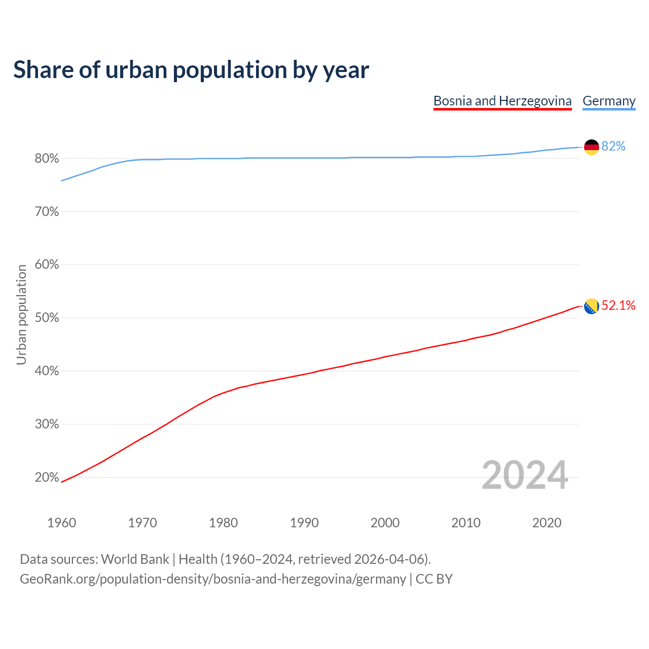 From 2004 to 2024, the share of urban population changed from 43.8% to 52.1% in Bosnia and Herzegovina and from 80.2% to 82% in Germany.