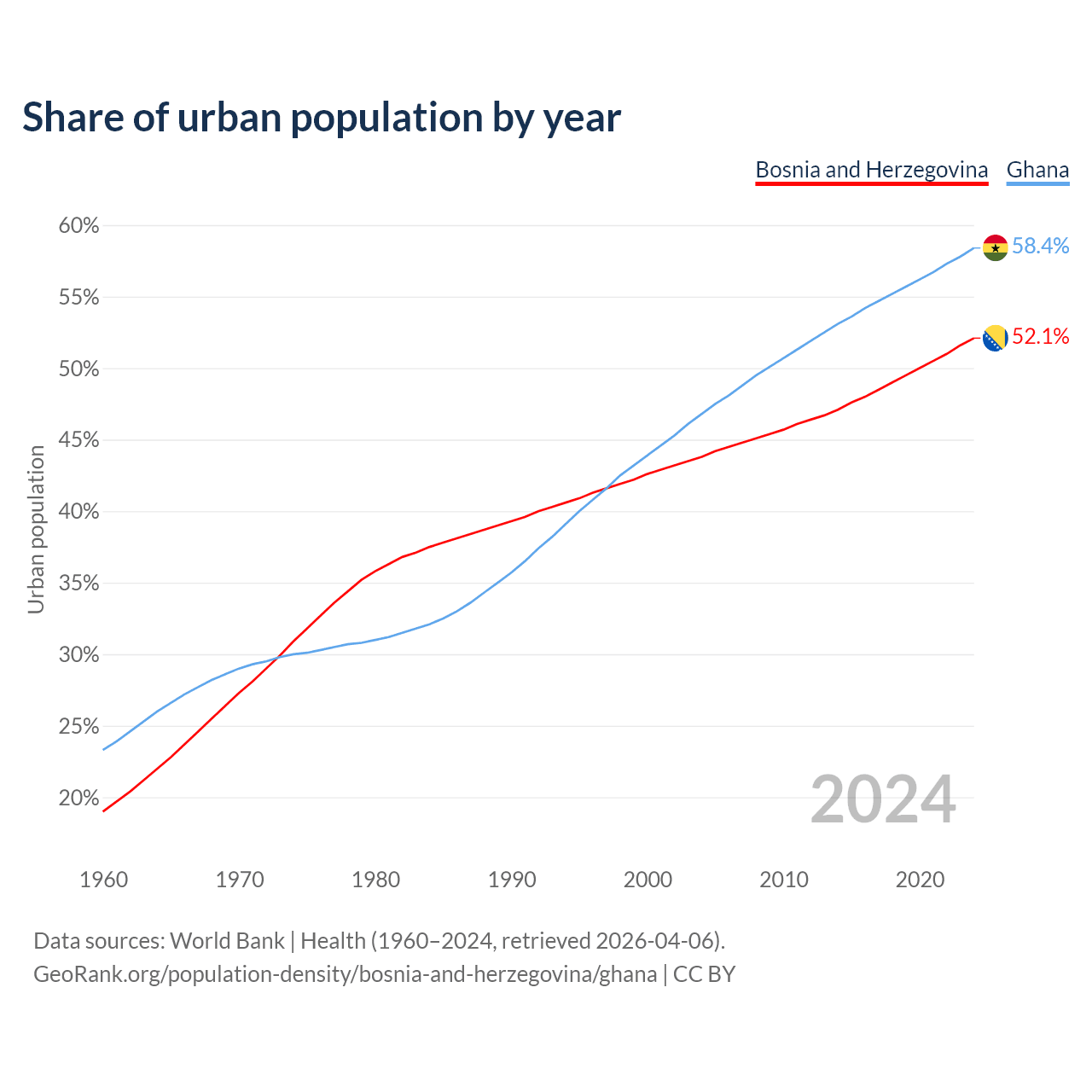 From 2004 to 2024, the share of urban population changed from 43.8% to 52.1% in Bosnia and Herzegovina and from 46.8% to 58.4% in Ghana.