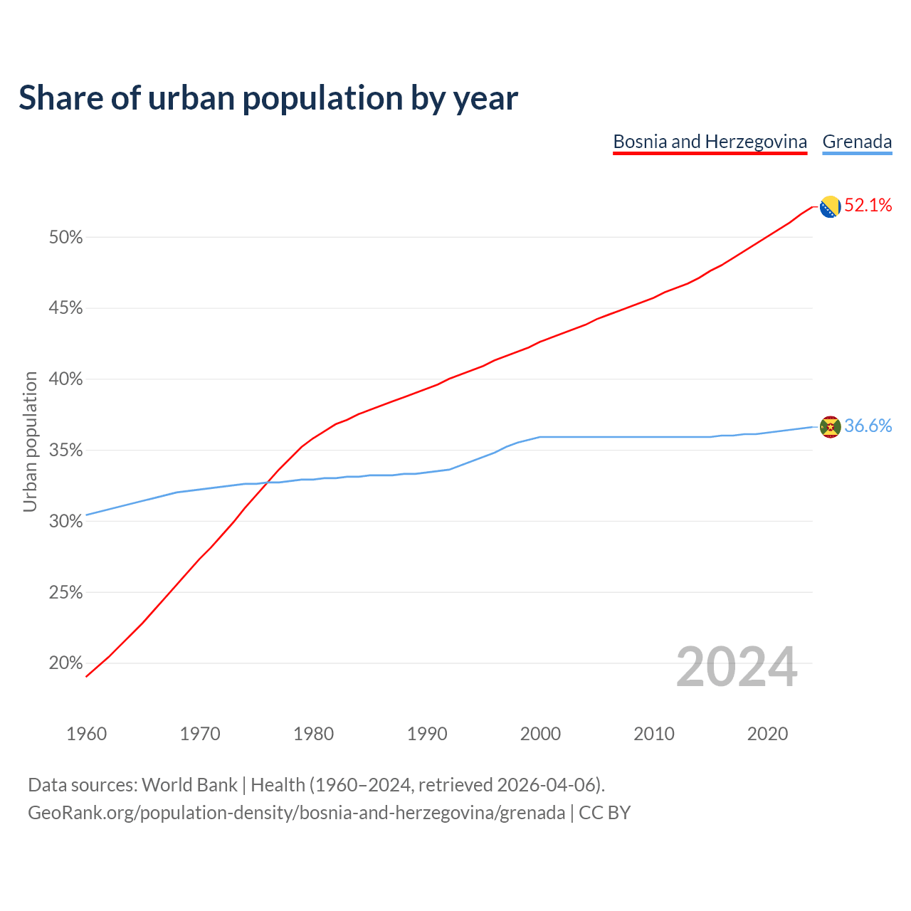 From 2004 to 2024, the share of urban population changed from 43.8% to 52.1% in Bosnia and Herzegovina and from 35.9% to 36.6% in Grenada.