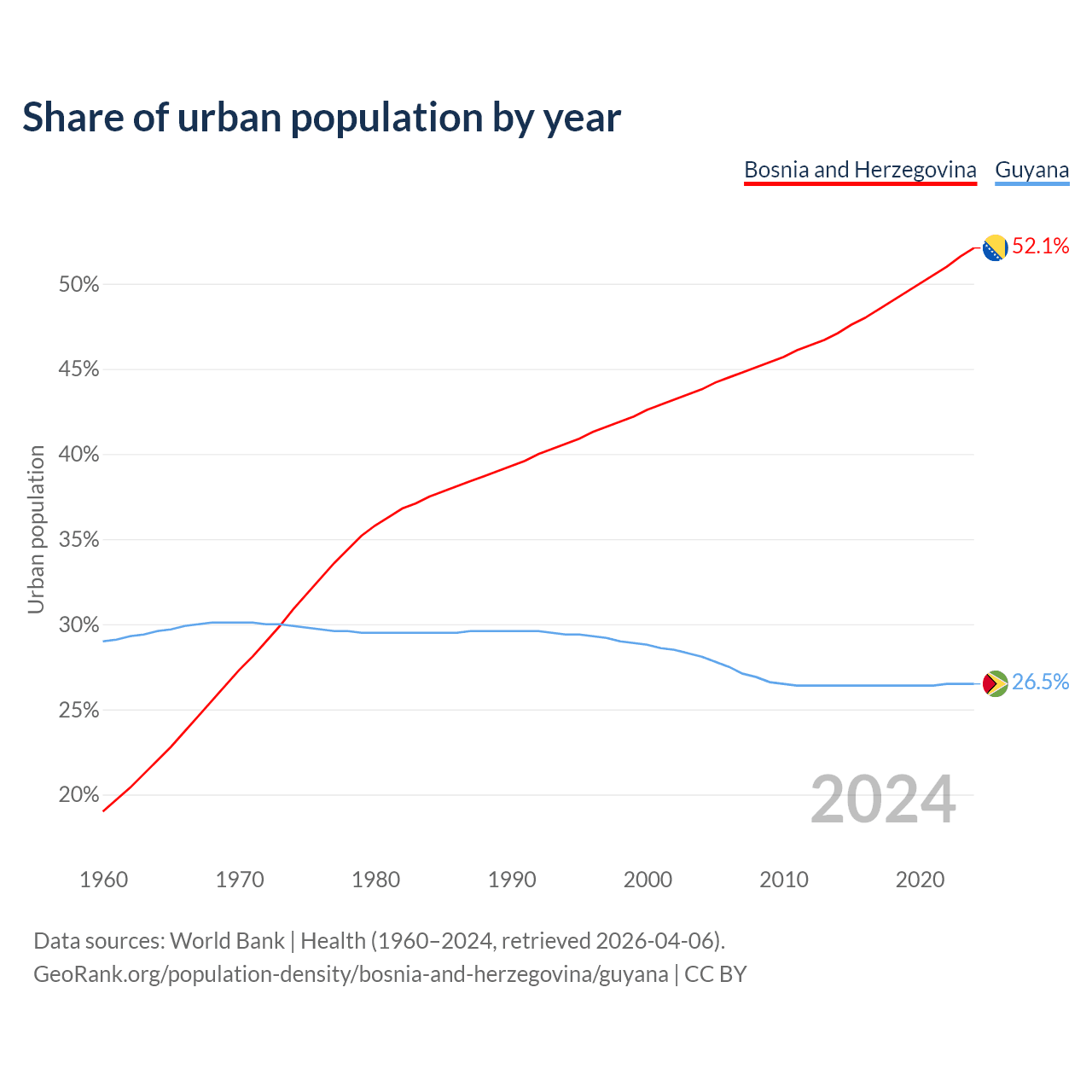 From 2006 to 2026, population density in Bosnia and Herzegovina decreased by 23.3%, compared to a 3.3% growth in Guyana.