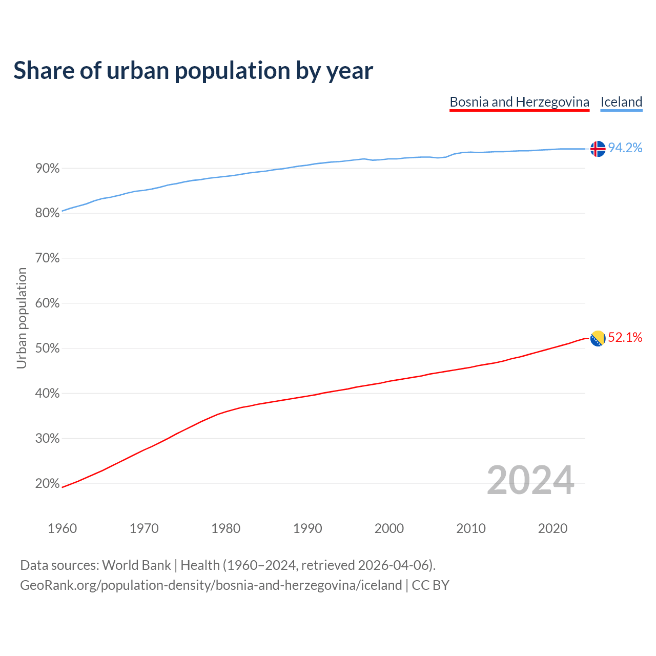 From 2004 to 2024, the share of urban population changed from 43.8% to 52.1% in Bosnia and Herzegovina and from 92.4% to 94.2% in Iceland.