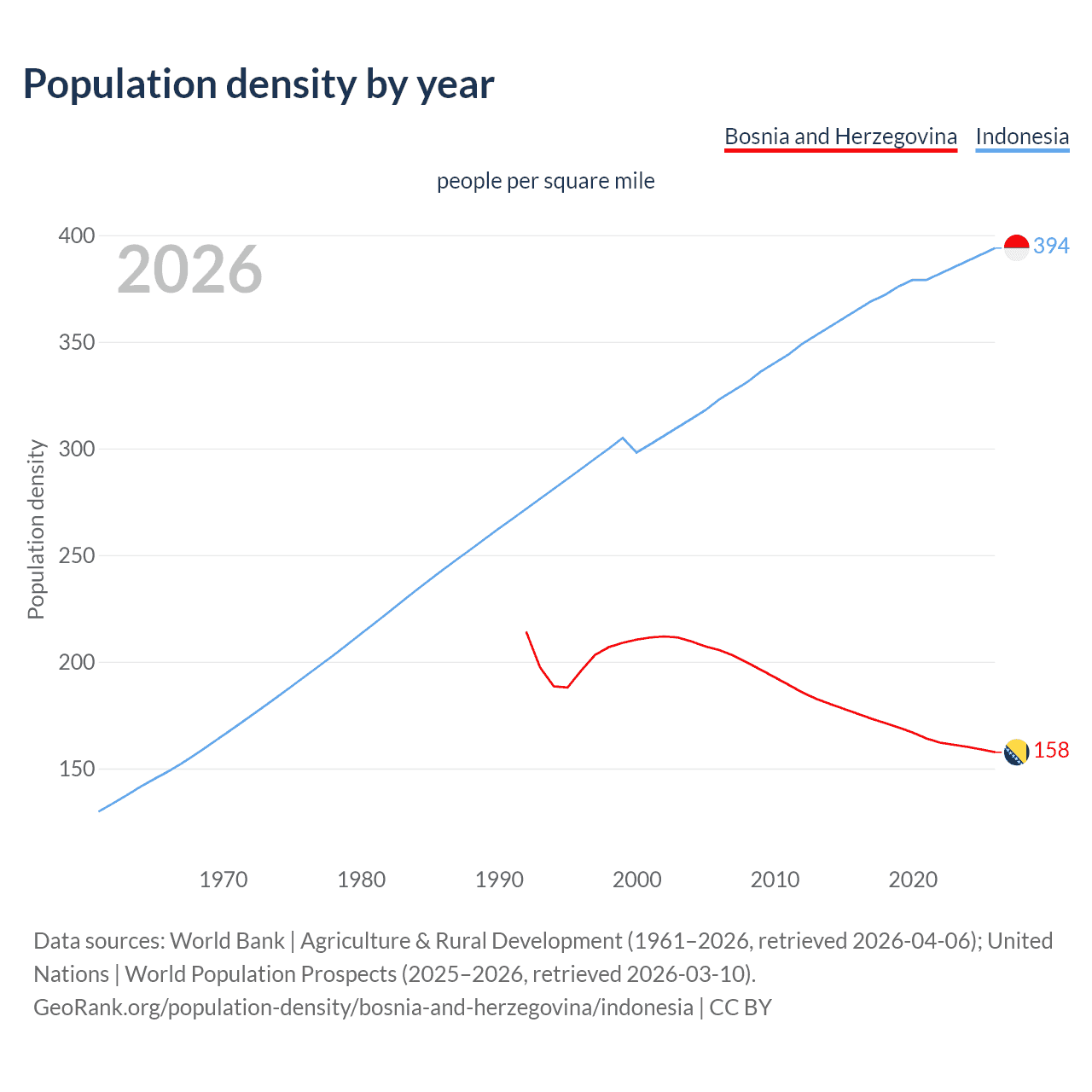 From 2006 to 2026, population density in Bosnia and Herzegovina decreased by 23.3%, compared to a 22.1% growth in Indonesia.
