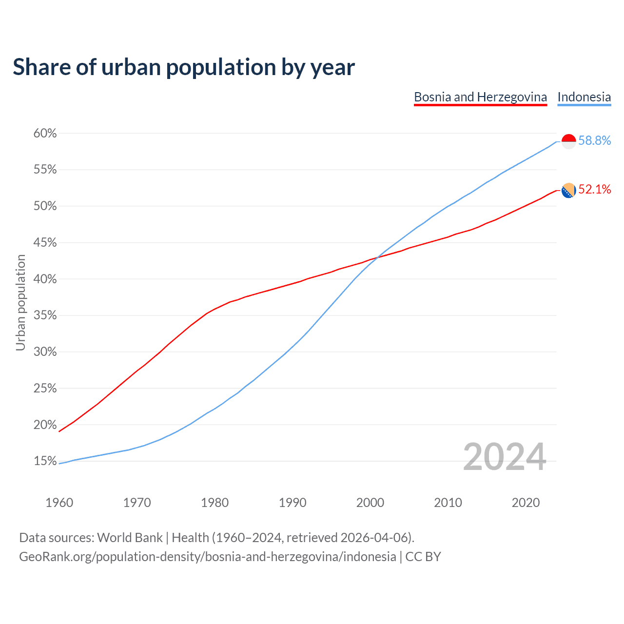 From 2004 to 2024, the share of urban population changed from 43.8% to 52.1% in Bosnia and Herzegovina and from 45.4% to 58.8% in Indonesia.