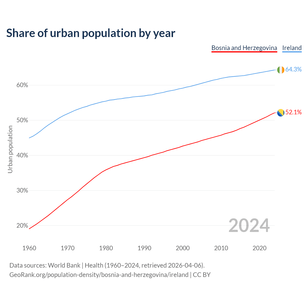 From 2004 to 2024, the share of urban population changed from 43.8% to 52.1% in Bosnia and Herzegovina and from 60.2% to 64.3% in Ireland.