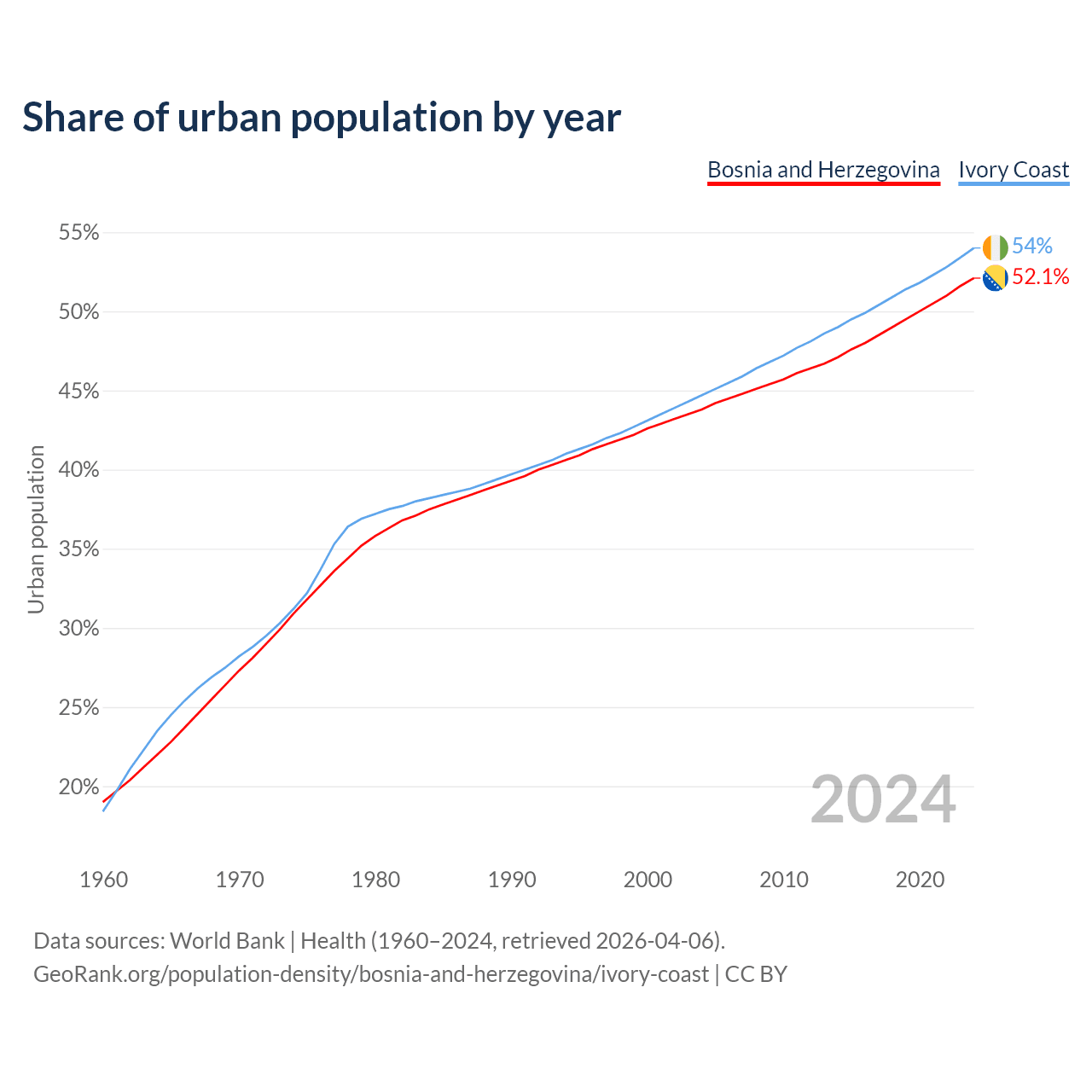 From 2004 to 2024, the share of urban population changed from 43.8% to 52.1% in Bosnia and Herzegovina and from 44.7% to 54% in Ivory Coast.