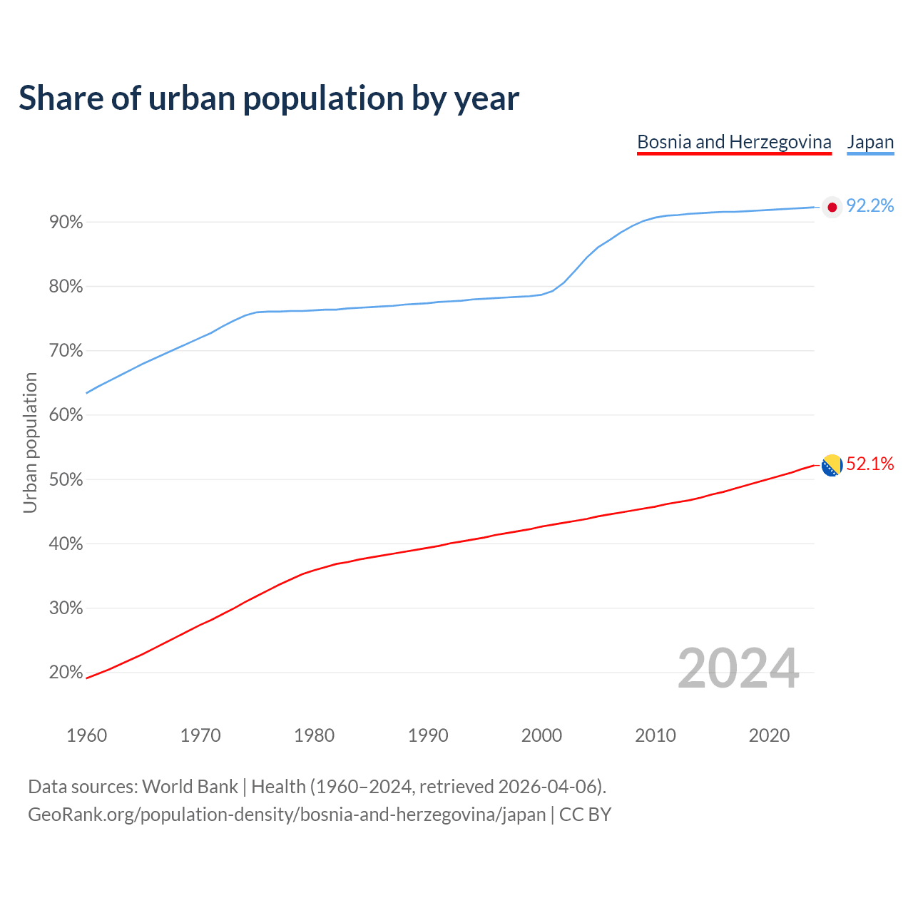 From 2004 to 2024, the share of urban population changed from 43.8% to 52.1% in Bosnia and Herzegovina and from 84.4% to 92.2% in Japan.