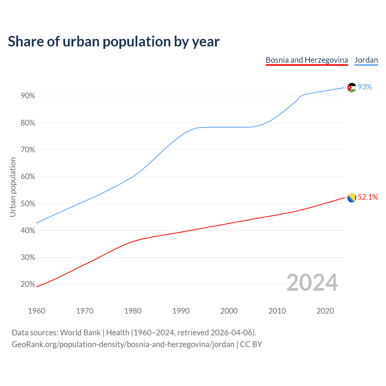 From 2004 to 2024, the share of urban population changed from 43.8% to 52.1% in Bosnia and Herzegovina and from 78.3% to 93% in Jordan.