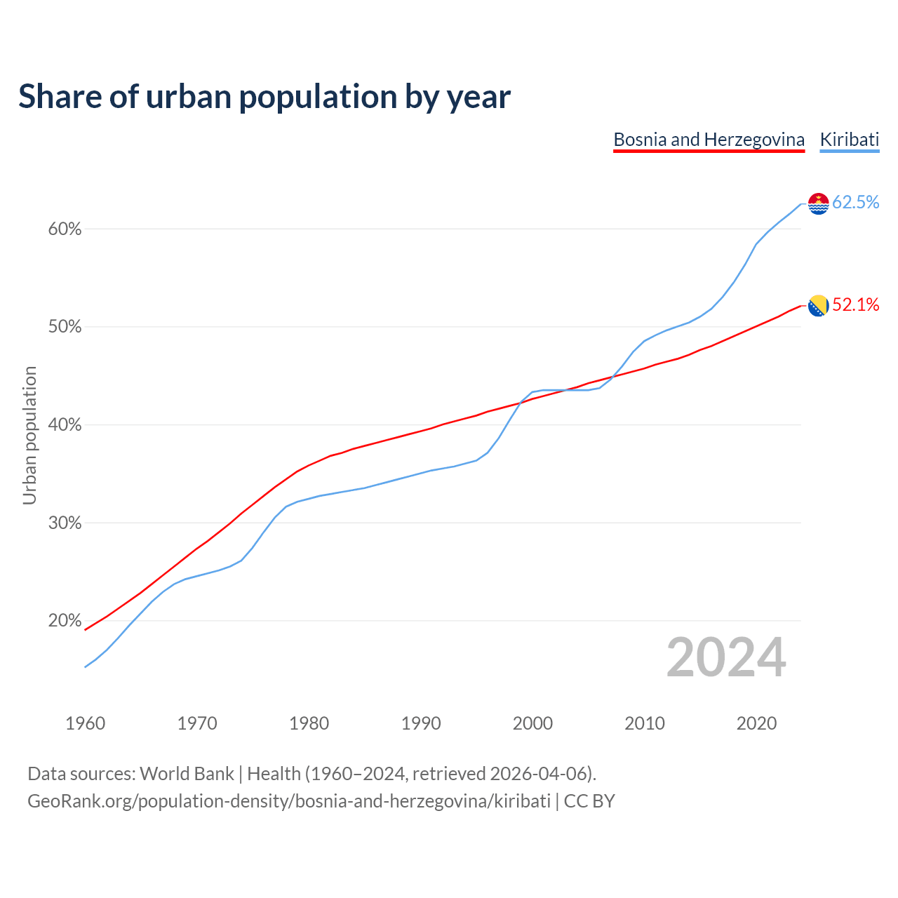 From 2004 to 2024, the share of urban population changed from 43.8% to 52.1% in Bosnia and Herzegovina and from 43.5% to 62.5% in Kiribati.