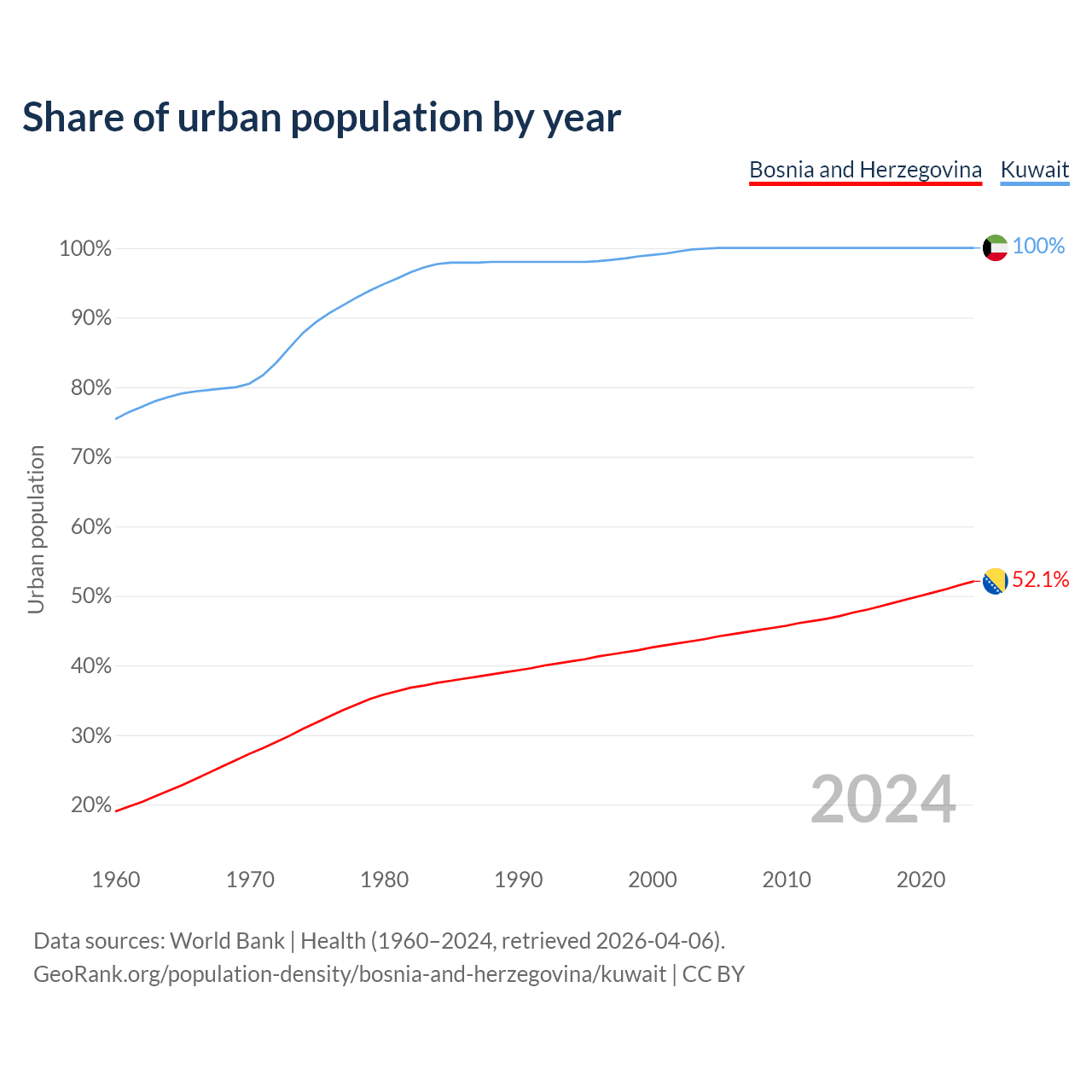 From 2004 to 2024, the share of urban population changed from 43.8% to 52.1% in Bosnia and Herzegovina and from 99.9% to 100% in Kuwait.