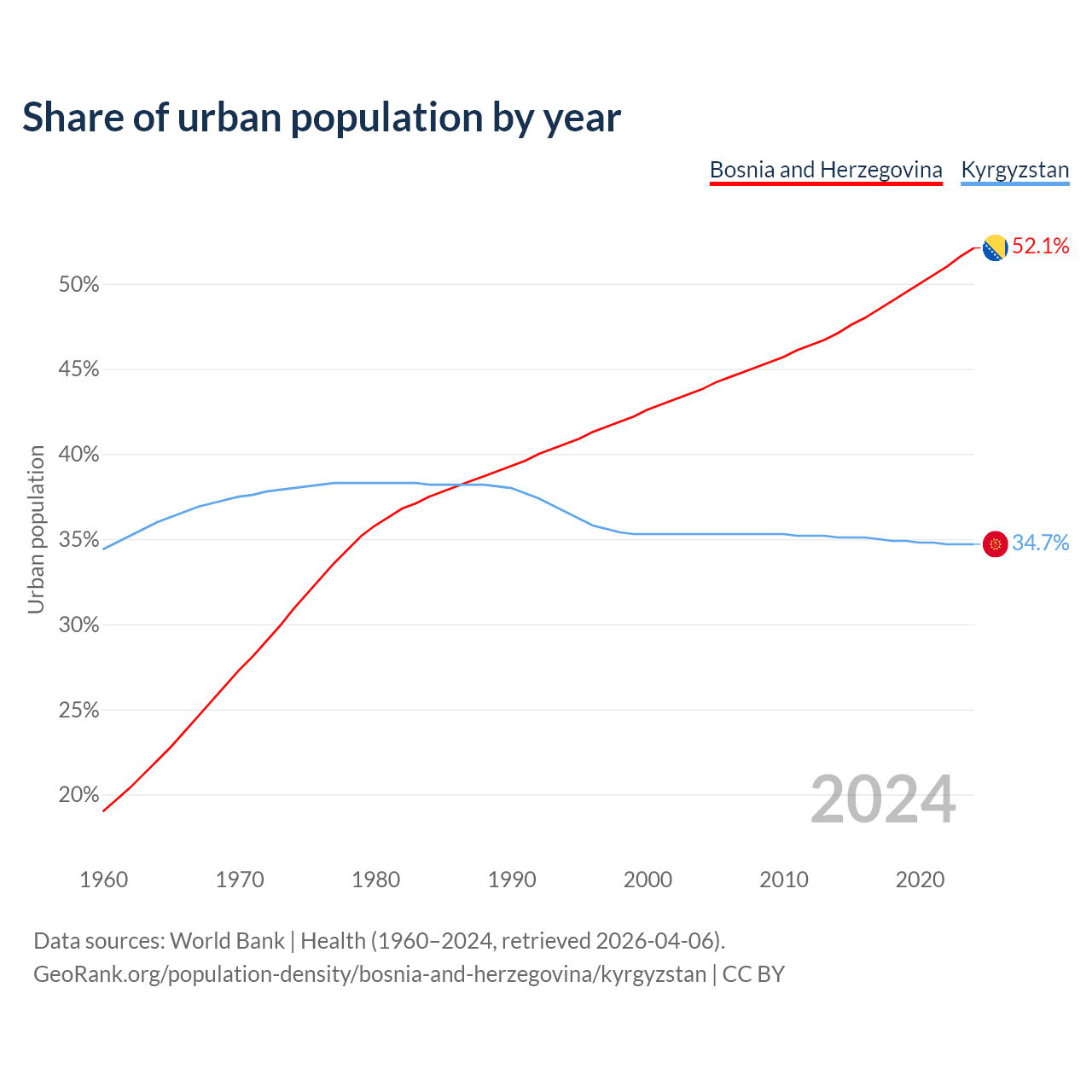 From 2004 to 2024, the share of urban population changed from 43.8% to 52.1% in Bosnia and Herzegovina and from 35.3% to 34.7% in Kyrgyzstan.