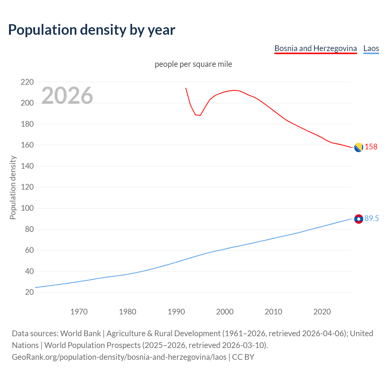 From 2006 to 2026, population density in Bosnia and Herzegovina decreased by 23.3%, compared to a 33.8% growth in Laos.