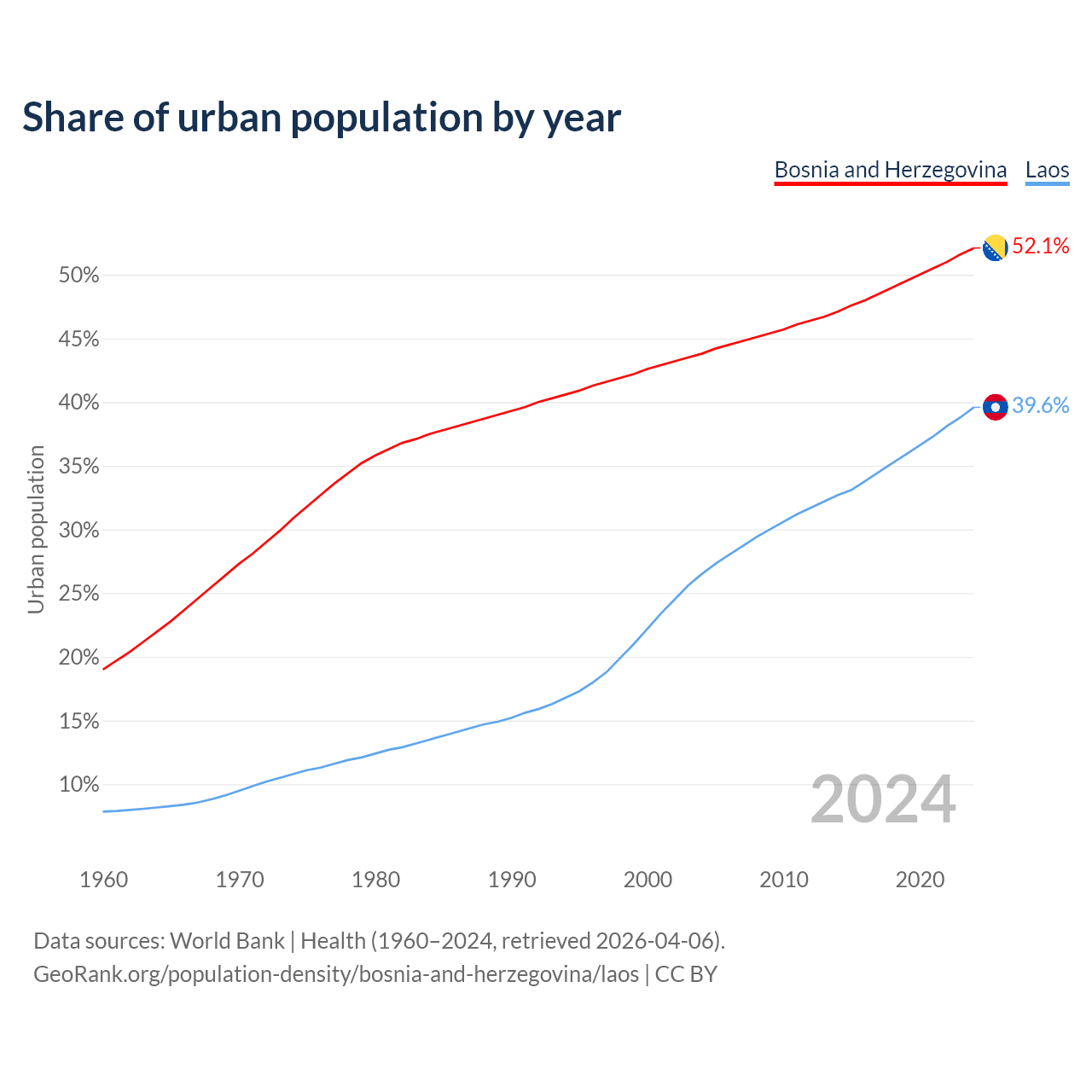 From 2004 to 2024, the share of urban population changed from 43.8% to 52.1% in Bosnia and Herzegovina and from 26.5% to 39.6% in Laos.