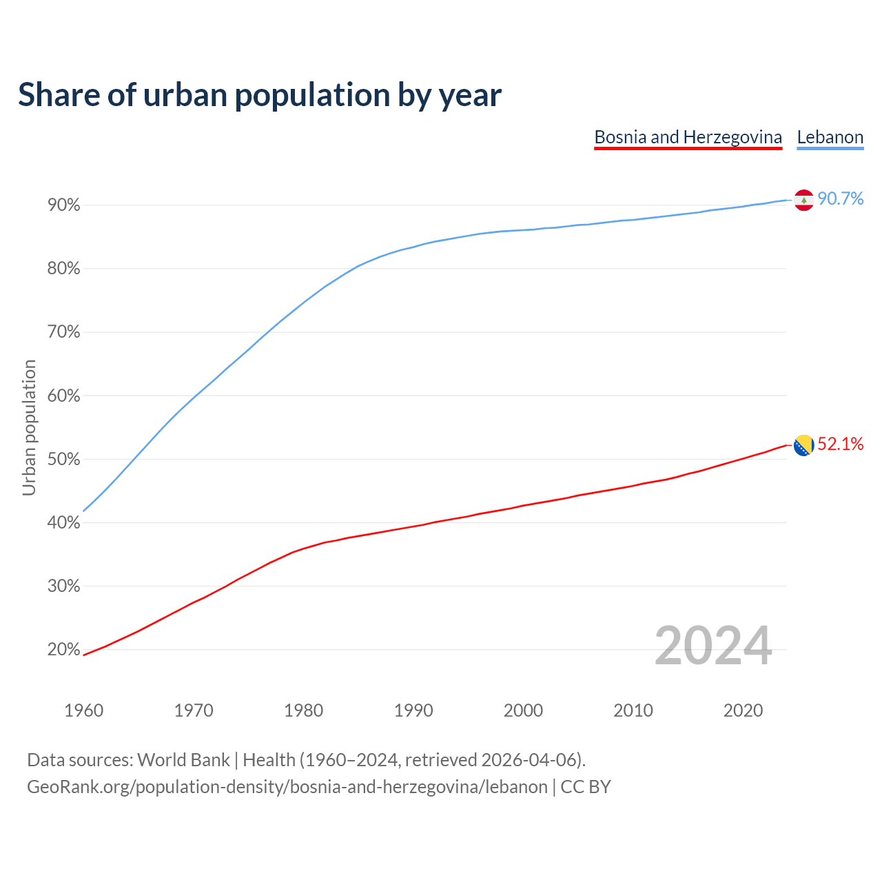 From 2006 to 2026, population density in Bosnia and Herzegovina decreased by 23.3%, compared to a 24% growth in Lebanon.
