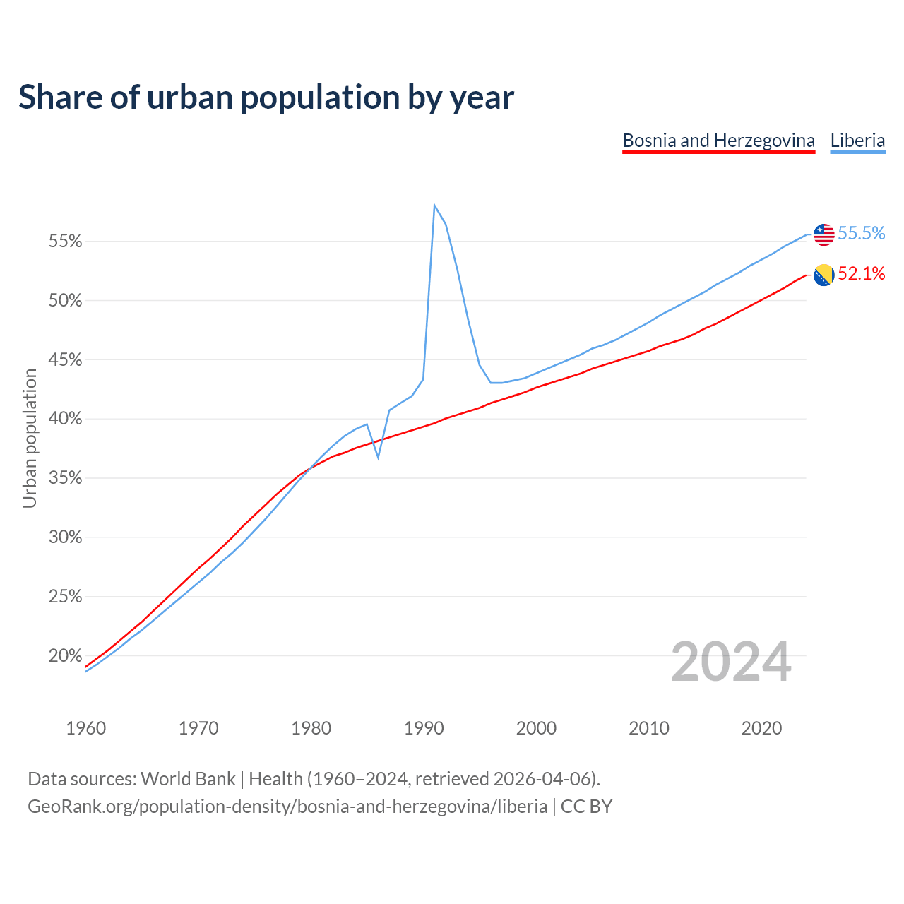 From 2004 to 2024, the share of urban population changed from 43.8% to 52.1% in Bosnia and Herzegovina and from 45.4% to 55.5% in Liberia.