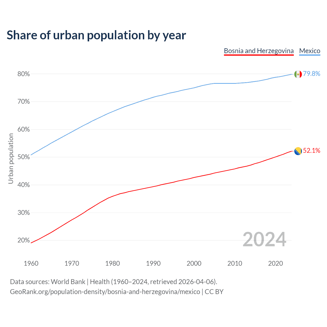 From 2004 to 2024, the share of urban population changed from 43.8% to 52.1% in Bosnia and Herzegovina and from 76.3% to 79.8% in Mexico.