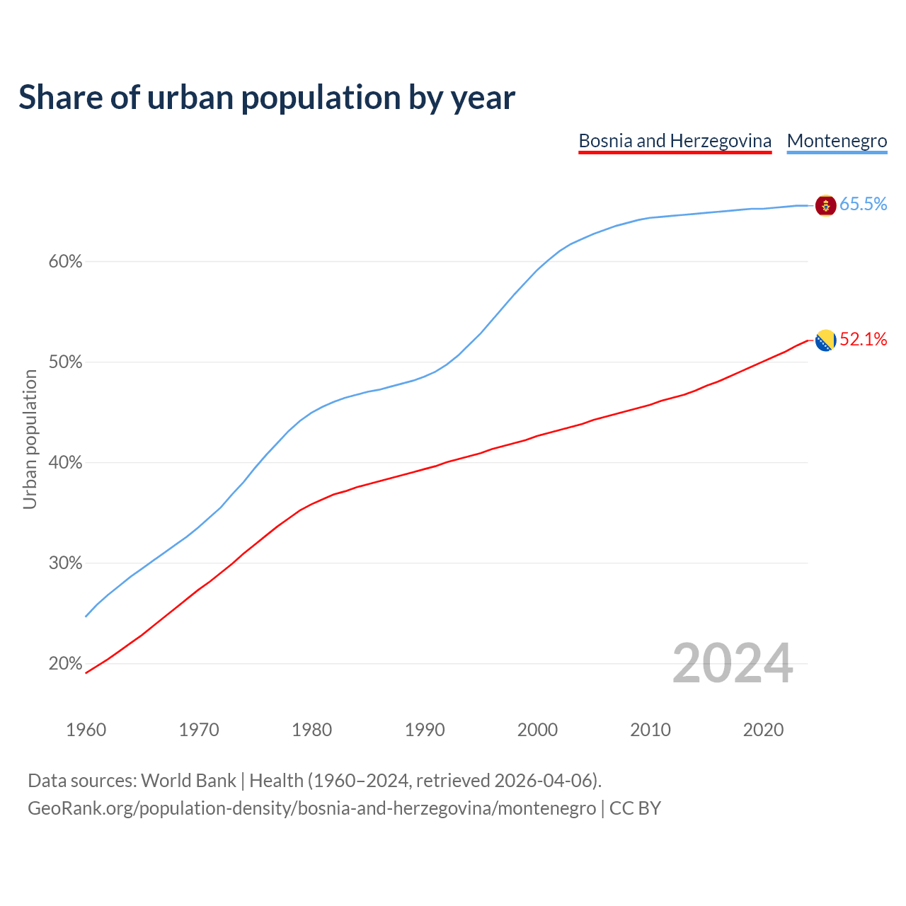 From 2004 to 2024, the share of urban population changed from 43.8% to 52.1% in Bosnia and Herzegovina and from 62.2% to 65.5% in Montenegro.