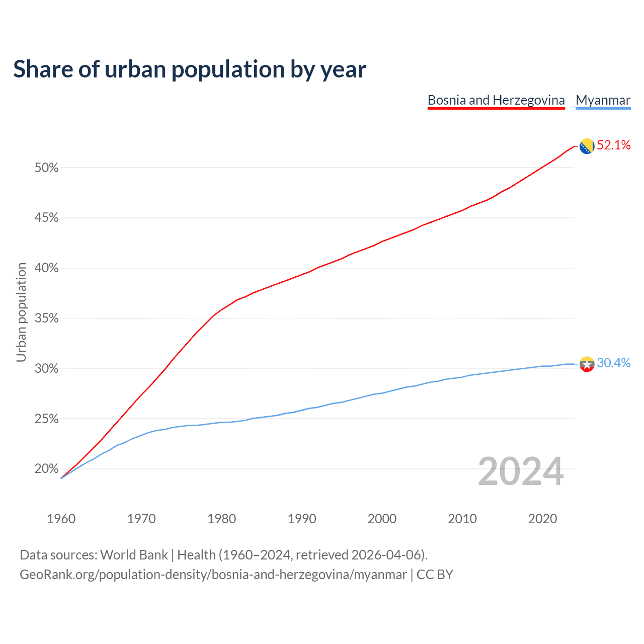 From 2004 to 2024, the share of urban population changed from 43.8% to 52.1% in Bosnia and Herzegovina and from 28.2% to 30.4% in Myanmar.