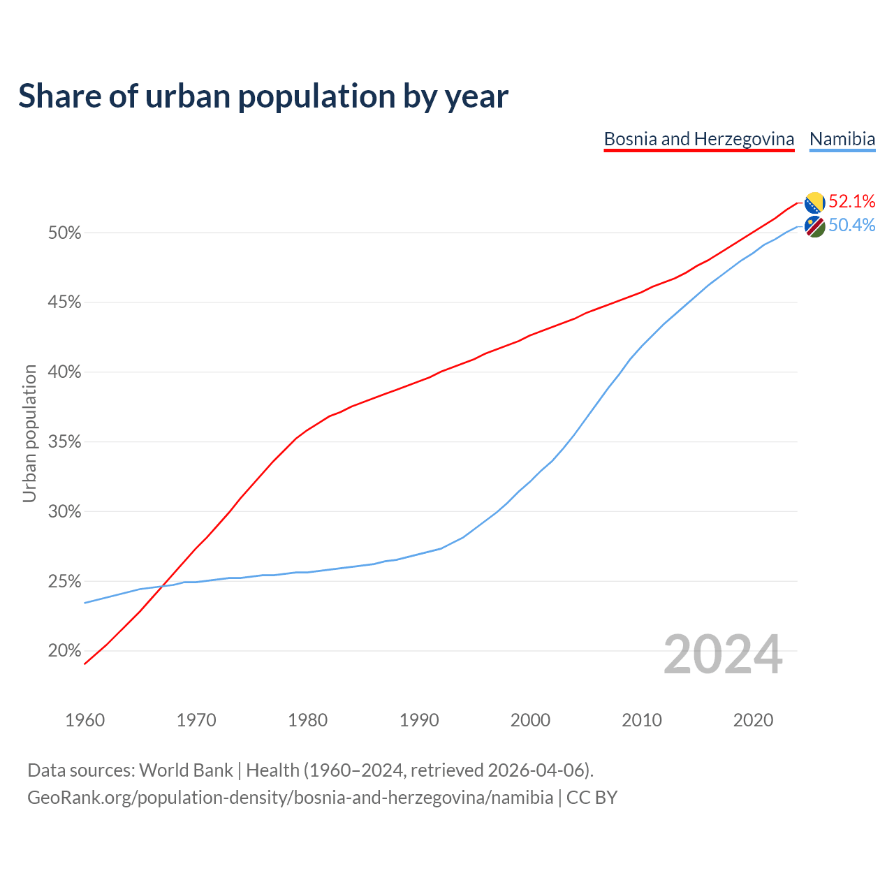 From 2004 to 2024, the share of urban population changed from 43.8% to 52.1% in Bosnia and Herzegovina and from 35.5% to 50.4% in Namibia.