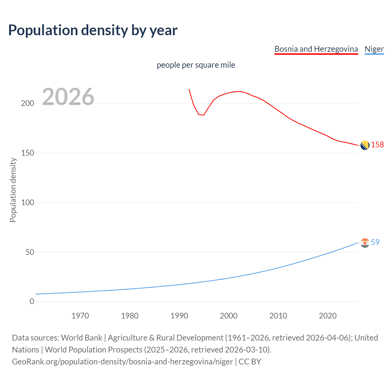 From 2006 to 2026, population density in Bosnia and Herzegovina decreased by 23.3%, compared to a 102.1% growth in Niger.