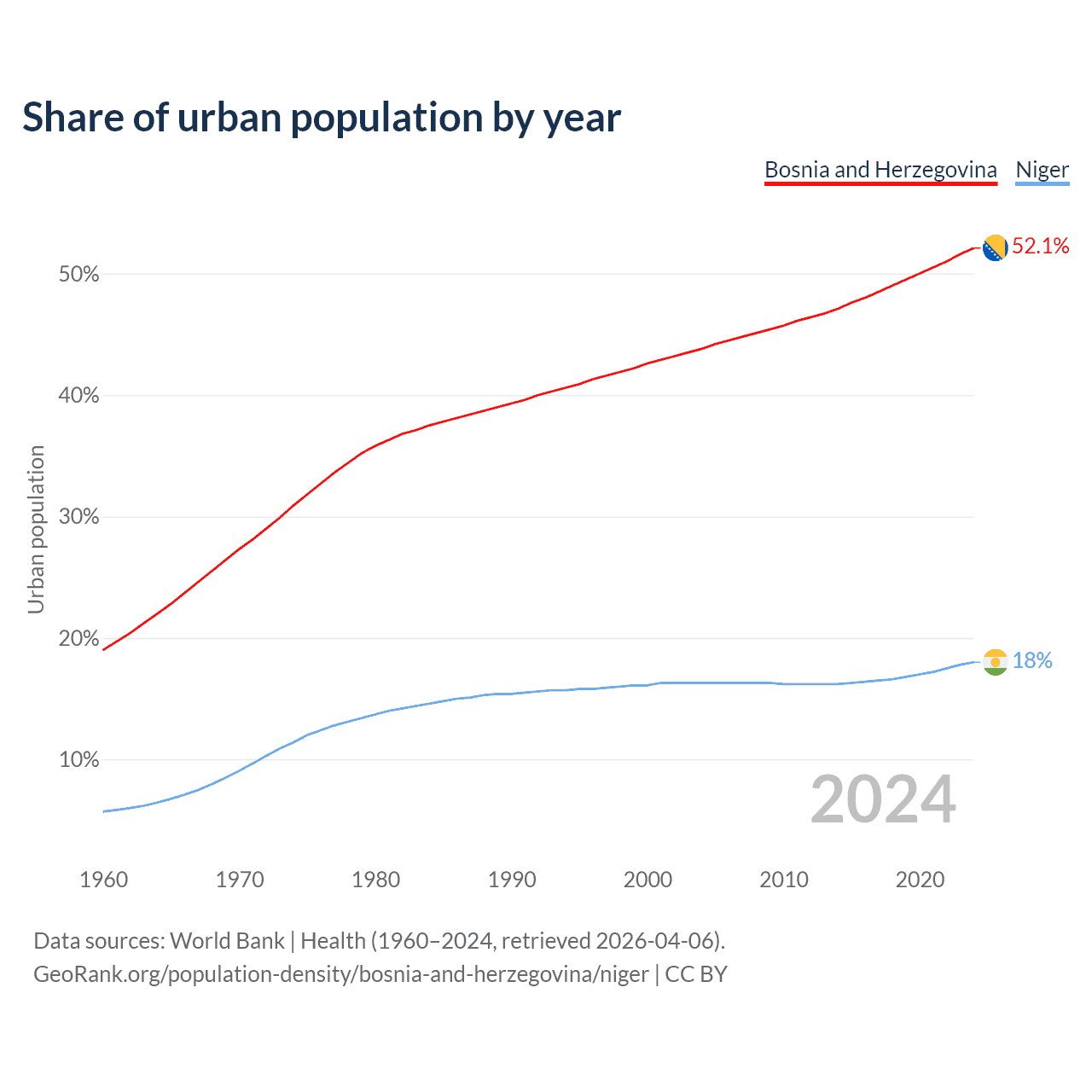 From 2004 to 2024, the share of urban population changed from 43.8% to 52.1% in Bosnia and Herzegovina and from 16.3% to 18% in Niger.
