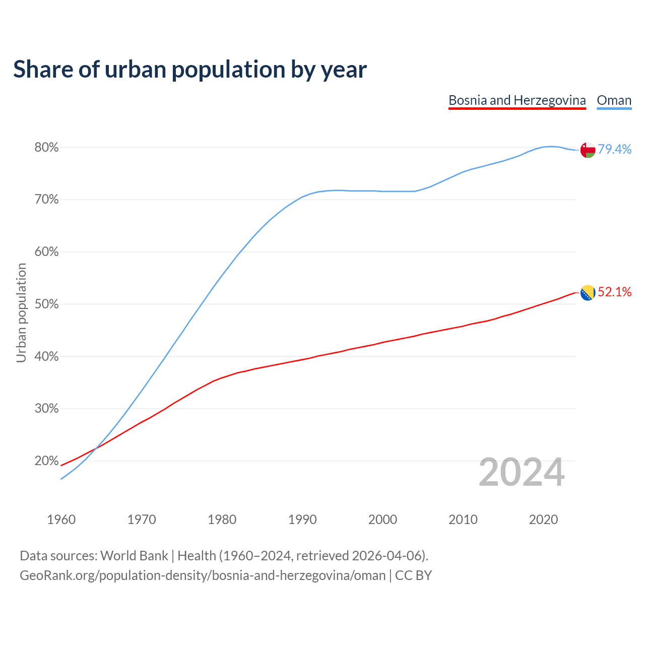 From 2004 to 2024, the share of urban population changed from 43.8% to 52.1% in Bosnia and Herzegovina and from 71.5% to 79.4% in Oman.