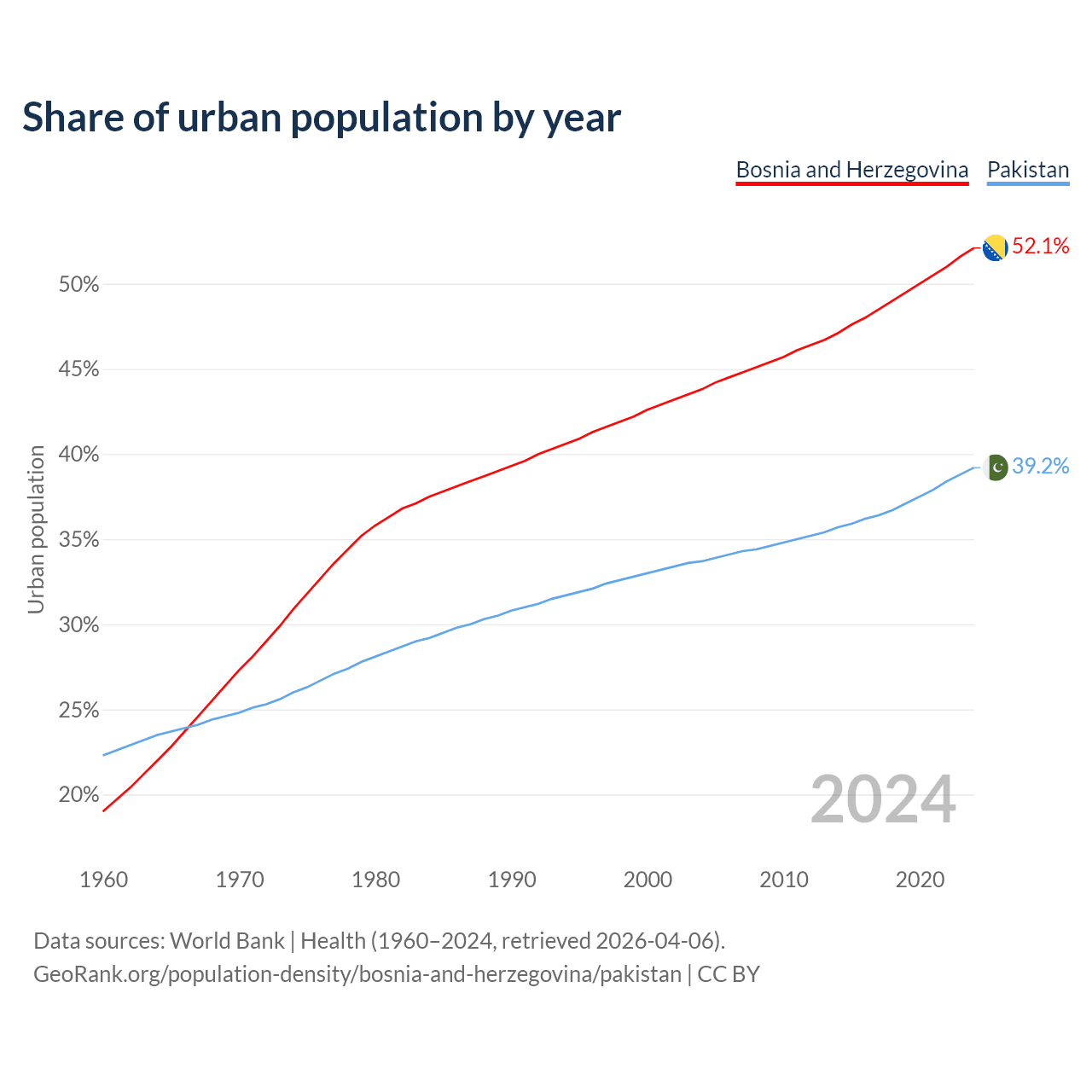 From 2004 to 2024, the share of urban population changed from 43.8% to 52.1% in Bosnia and Herzegovina and from 33.7% to 39.2% in Pakistan.