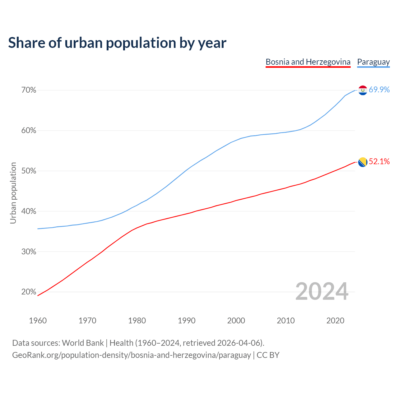 From 2004 to 2024, the share of urban population changed from 43.8% to 52.1% in Bosnia and Herzegovina and from 58.7% to 69.9% in Paraguay.