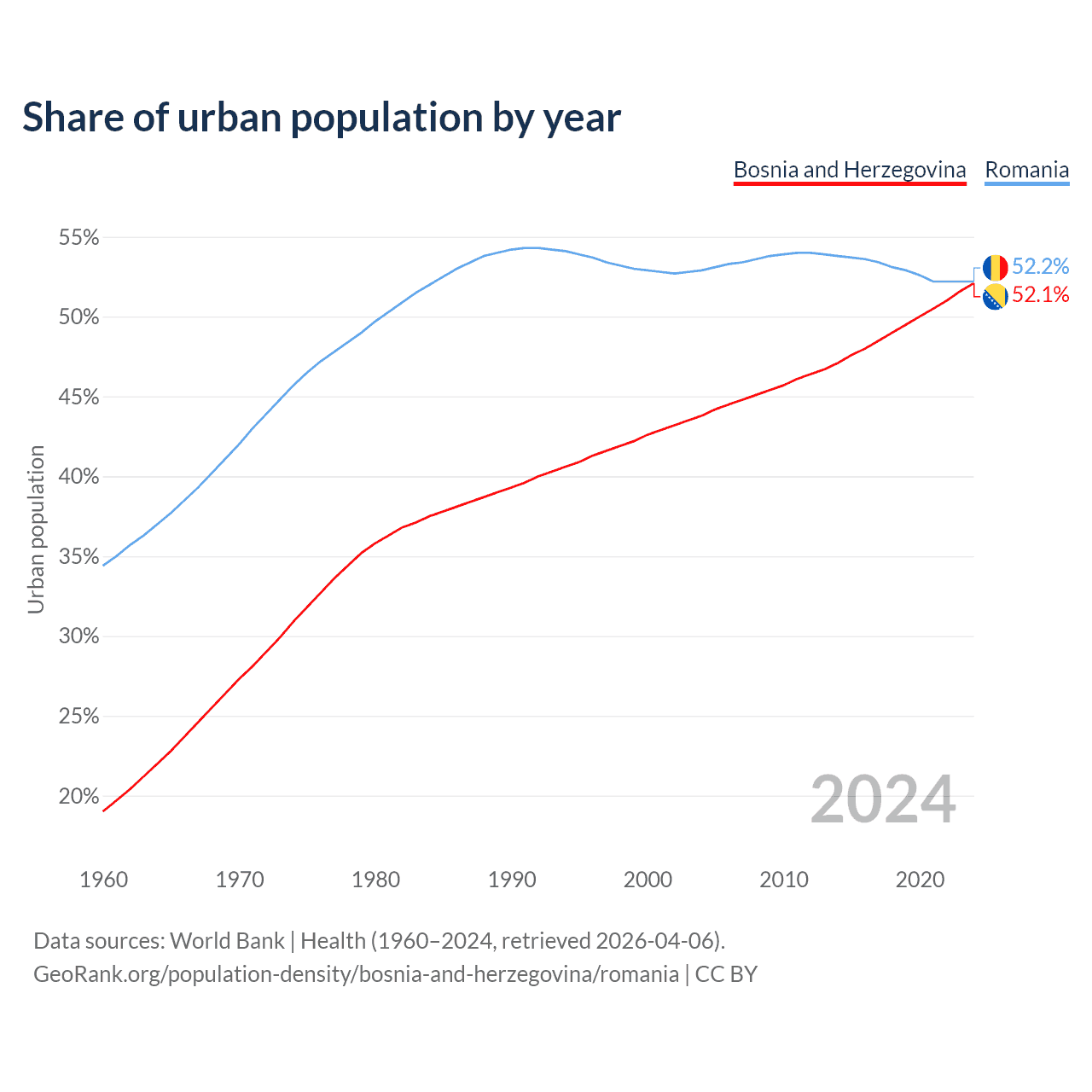 From 2004 to 2024, the share of urban population changed from 43.8% to 52.1% in Bosnia and Herzegovina and from 52.9% to 52.2% in Romania.
