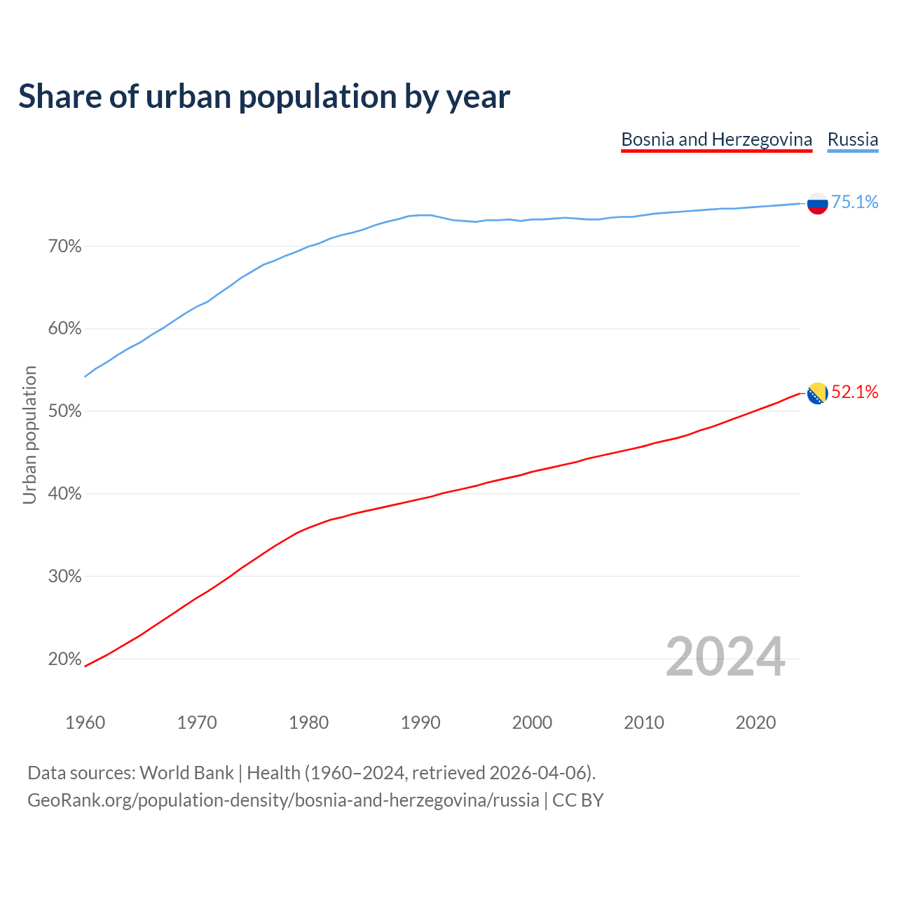 From 2004 to 2024, the share of urban population changed from 43.8% to 52.1% in Bosnia and Herzegovina and from 73.3% to 75.1% in Russia.