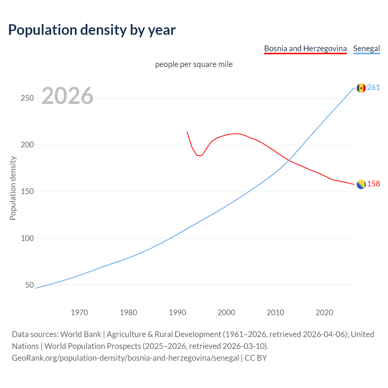From 2006 to 2026, population density in Bosnia and Herzegovina decreased by 23.3%, compared to a 68.5% growth in Senegal.
