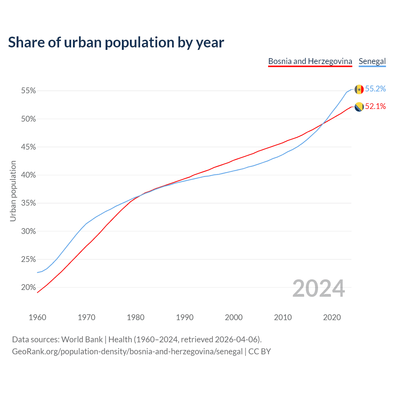 From 2004 to 2024, the share of urban population changed from 43.8% to 52.1% in Bosnia and Herzegovina and from 41.6% to 55.2% in Senegal.