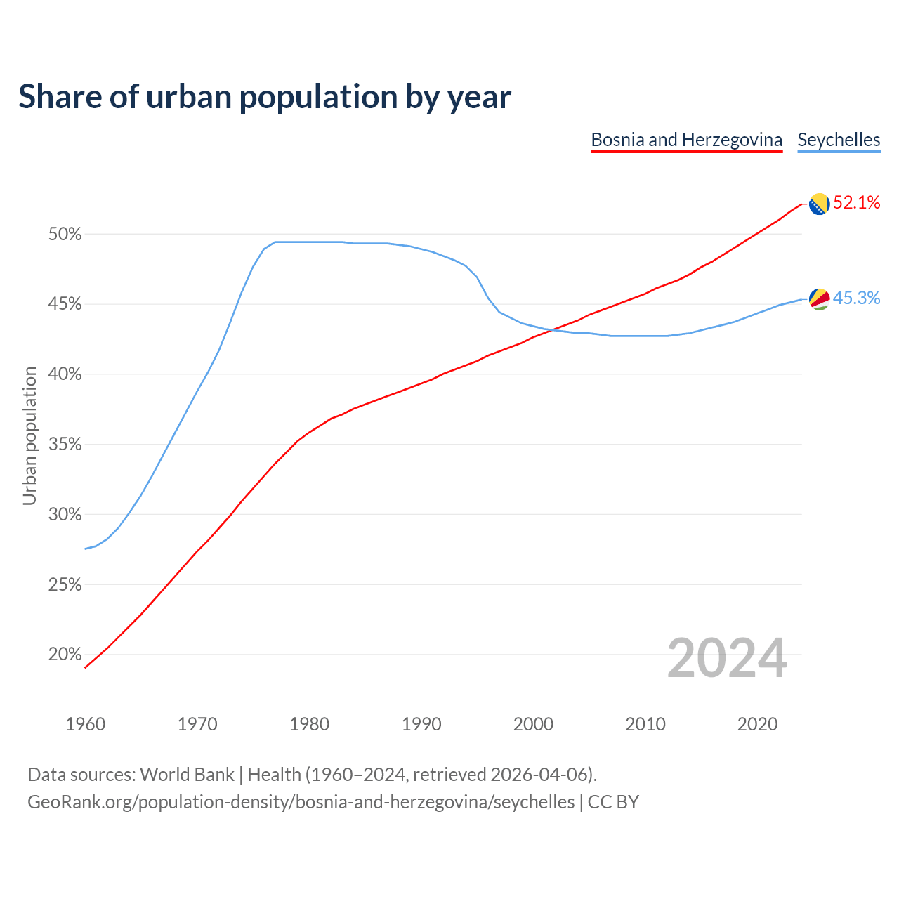 From 2004 to 2024, the share of urban population changed from 43.8% to 52.1% in Bosnia and Herzegovina and from 42.9% to 45.3% in the Seychelles.