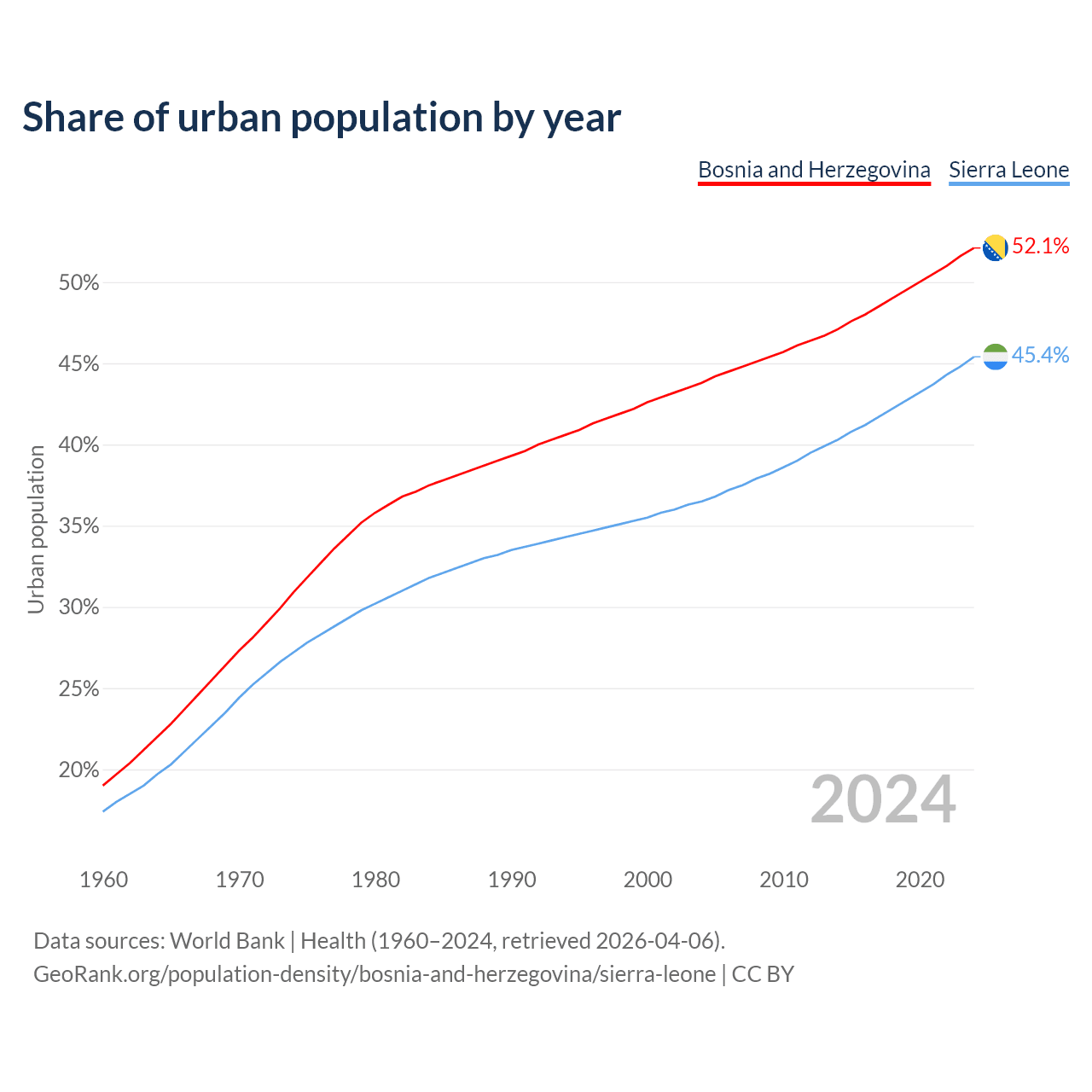 From 2004 to 2024, the share of urban population changed from 43.8% to 52.1% in Bosnia and Herzegovina and from 36.5% to 45.4% in Sierra Leone.